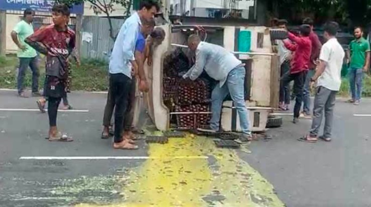 প্রত্যক্ষদর্শীরা জানান, গাড়ির সামনের অংশের চাকা বার্স্ট হয়ে হঠাৎ মহাসড়কে লেগুনা উল্টে যায়। ডিমগুলো সড়কে পড়ে নষ্ট হয়ে যায়। গাড়িচালককে স্থানীয়রা উদ্ধার করে হাসপাতালে নিয়ে যান।