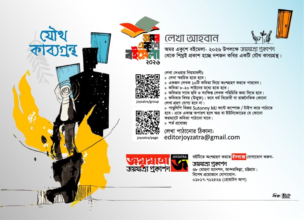 দেশচিন্তা ডেস্ক: অমর একুশে বইমেলা- ২০২৬ উপলক্ষে জয়যাত্রা প্রকাশন থেকে শিঘ্রই প্রকাশ হচ্ছে একটি যৌথ কাব্যগ্রন্থ। এ গ্রন্থের জন্য আগ্রহী লেখকদের কাছ থেকে লেখা আহবান করা হয়েছে।