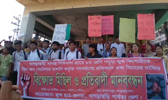 খাগড়াছড়িতে অষ্টম শ্রেণির শিক্ষার্থীকে গণধর্ষণের প্রতিবাদে এবং বিচারের দাবিতে বিক্ষোভ হয়েছে।