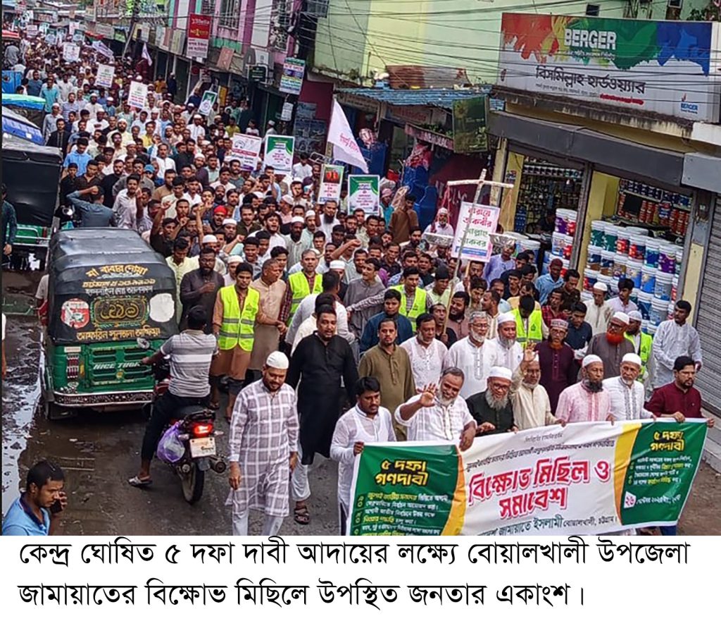 বোয়ালখালী উপজেলা জামায়াতের উদ্যোগে বিকাল ৫ টায় অনুষ্ঠিত বিক্ষোভ মিছিলে প্রধান অতিথি ছিলেন জামায়াতের জেলা এসিস্ট্যান্ট সেক্রেটারি মুহাম্মদ জাকারিয়া। এতে আরও উপস্থিত ছিলেন চট্টগ্রাম-৮ আসনের জামায়াতের মনোনীত প্রার্থী ডাঃ আবু নাছের, জেলা কর্মপরিষদ সদস্য মাওলানা আরিফুর রশিদ, বোয়ালখালী উপজেলা আমীর ডাঃ খোরশেদ আলম, পৌরসভার আমীর মাষ্টার হারুনুর রশিদ সহ প্রমুখ নেতৃবৃন্দ।
