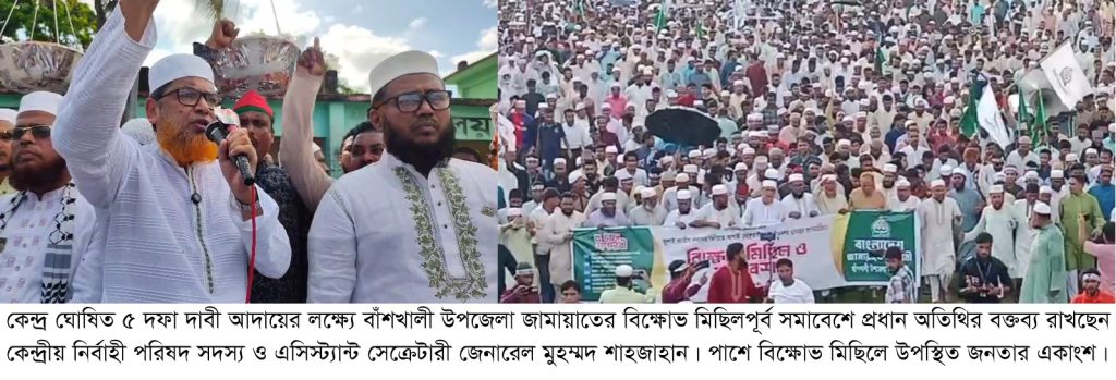 বাঁশখালী উপজেলা উপজেলা জামায়াতের উদ্যোগে বেলা ২ টায় জলদীতে অনুষ্ঠিত বিক্ষোভ মিছিল ও সমাবেশ প্রধান অতিথি ছিলেন জামায়াতে ইসলামীর কেন্দ্রীয় নির্বাহী পরিষদ সদস্য ও এসিস্ট্যান্ট সেক্রেটারি জেনারেল মুহাম্মদ শাহজাহান।