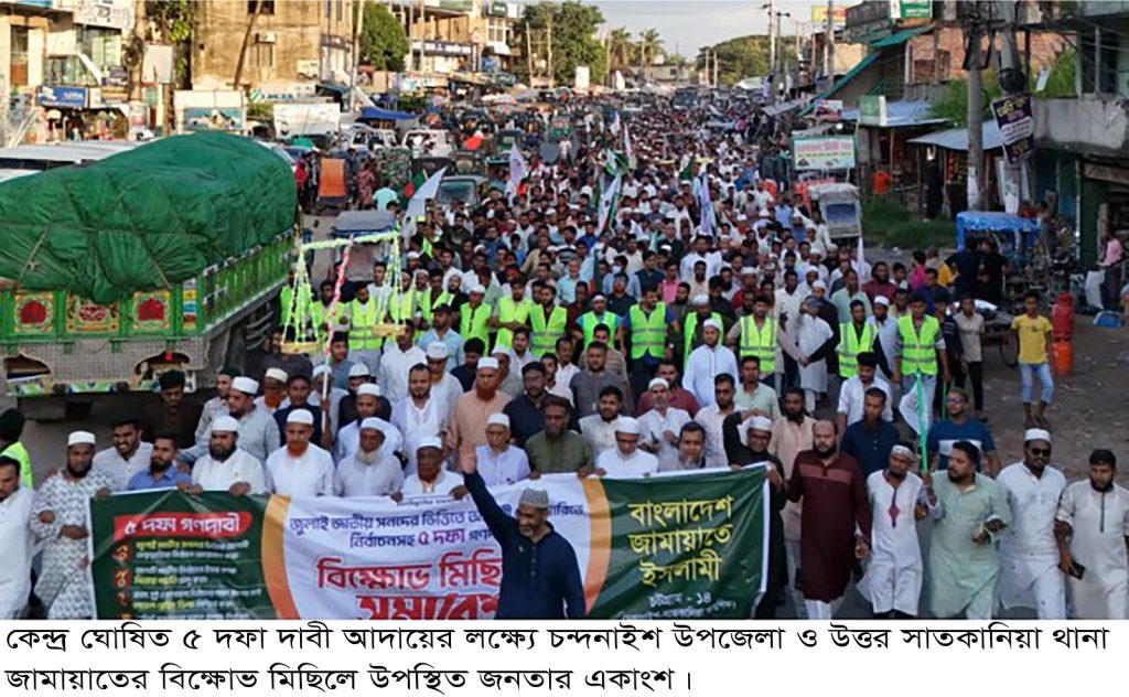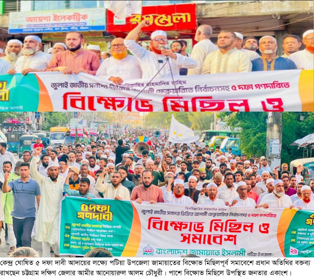 দেশচিন্তা ডেস্ক: কেন্দ্র ঘোষিত পাঁচ দফা দাবি আদায়ের লক্ষ্যে ২৬ সেপ্টেম্বর (জুমাবার) চট্টগ্রাম দক্ষিণ জেলার প্রতিটি উপজেলা ও থানায় জামায়াতের উদ্যোগে বিক্ষোভ মিছিল ও সমাবেশ অনুষ্ঠিত হয়।