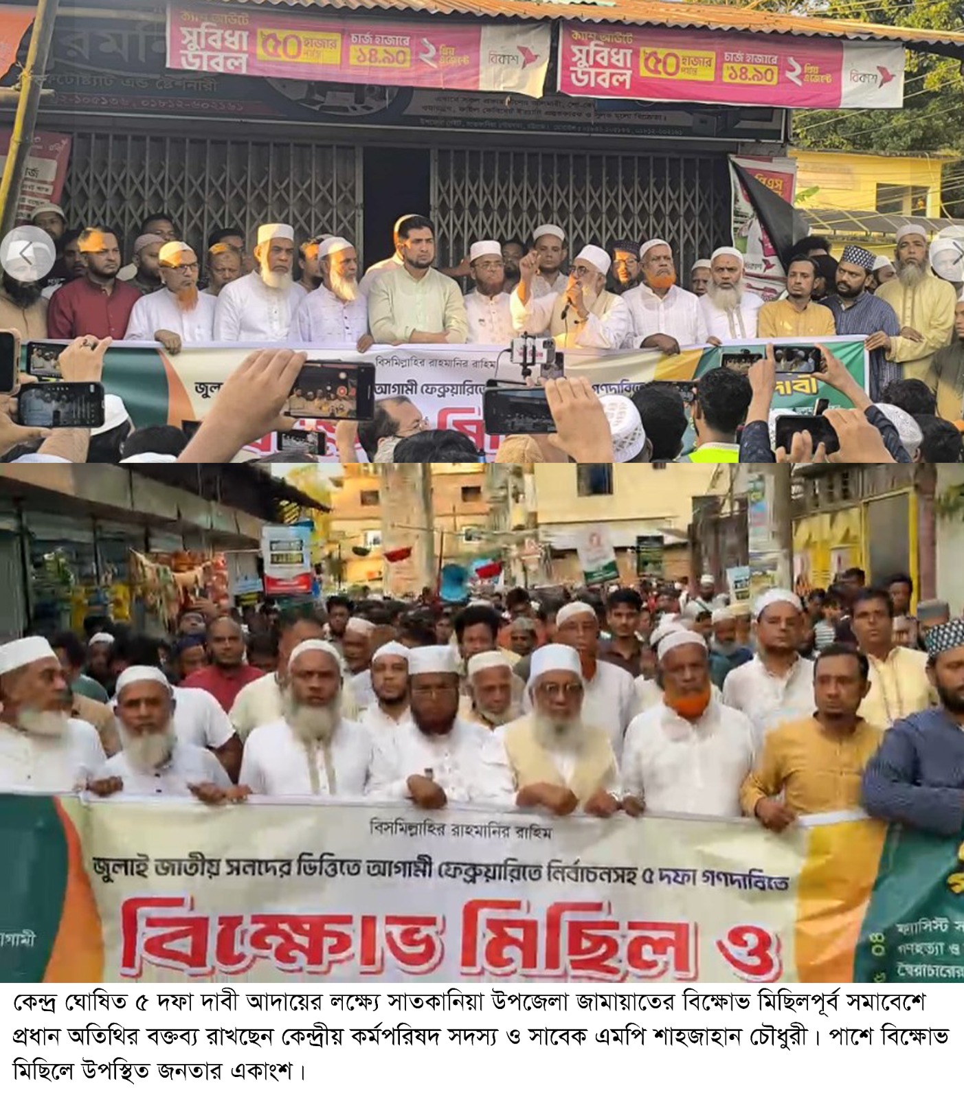সাতকানিয়া উপজেলার উদ্যোগে বিকাল ৫ টায় পৌরসদরে অনুষ্ঠিত বিক্ষোভ মিছিল ও সমাবেশে প্রধান অতিথি ছিলেন জামায়াতে ইসলামীর কেন্দ্রীয় কর্মপরিষদ সদস্য, সাতকানিয়া- লোহাগাড়ার জননন্দিত মজলুম জননেতা সাবেক এমপি আলহাজ্ব শাহজাহান চৌধুরী। এতে আরও উপস্থিত ছিলেন চট্টগ্রাম দক্ষিণ জেলা সেক্রেটারী অধ্যক্ষ মাওলানা বদরুল হক, জেলা কর্মপরিষদ সদস্য মাওলানা আবুল ফয়েজ, এম ওয়াজেদ আলী, উপজেলা আমীর মাওলানা কামাল উদ্দীন, সাতকানিয়া পৌরসভার আমীর অধ্যক্ষ হামিদ উদ্দীন আজাদ, কেরানীহাট শহর শাখার আমীর মুহাম্মদ নাছির উদ্দীন সহ প্রমুখ নেতৃবৃন্দ।