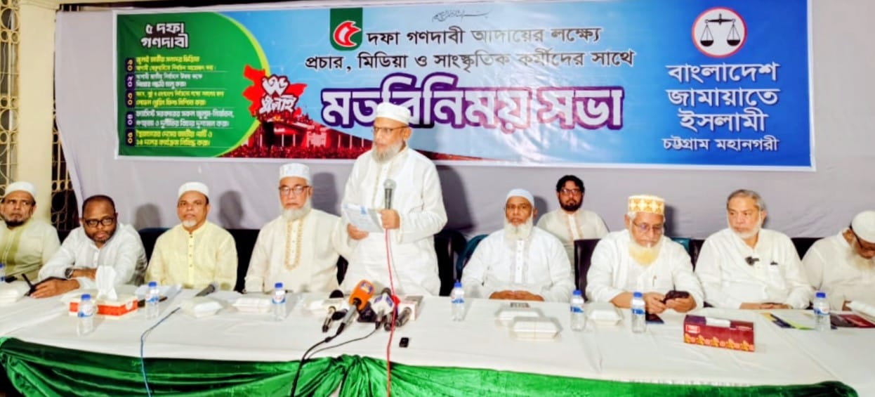 আজ রবিবার বাংলাদেশ ইসলামী একাডেমি (বিআইএ) মিলনায়তনে চট্টগ্রাম মহানগরীর জামায়াতের উদ্যােগে ৫দফা গণদাবী আদায়ের লক্ষ্যে সাংবাদিক ও সাংস্কৃতিক ব্যক্তিদের নিয়ে মতবিনিময় সভায় প্রধান অতিথির বক্তব্যে তিনি এসব কথা বলেন।