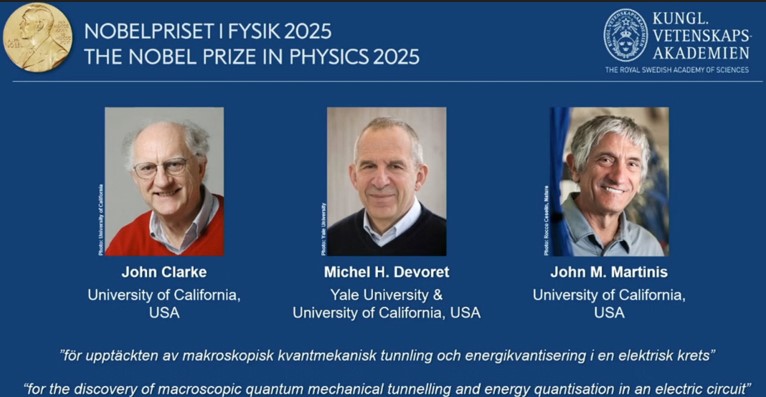 দেশচিন্তা ডেস্ক: এ বছর পদার্থবিজ্ঞানে যৌথভাবে নোবেল পেয়েছেন জন ক্লার্ক, মিশেল দেভরেট ও জন এম মার্টিনিস। তারা ইউনিভার্সিটি অব ক্যালিফোর্নিয়ার গবেষক।
