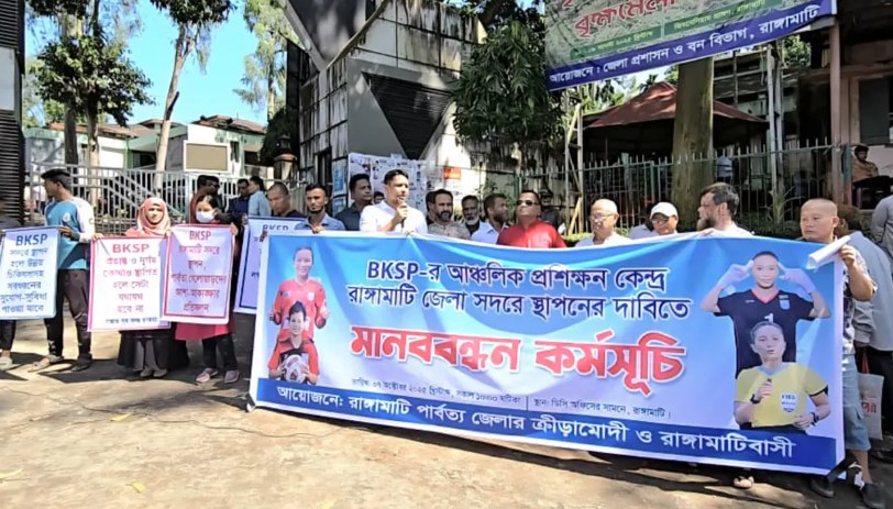 রাঙামাটি সদর থেকে বিকেএসপি সরিয়ে নেওয়ার প্রতিবাদে মানববন্ধন