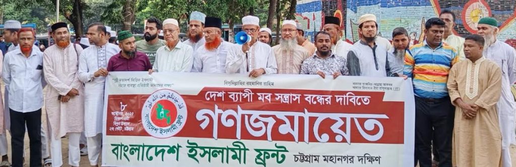 দেশচিন্তা ডেস্ক: দেশব্যাপী মব সন্ত্রাস বন্ধ ও নিবন্ধিত সকল রাজনৈতিক দলের অংশগ্রহণে সুষ্ঠু ও নিরপেক্ষ নির্বাচন নিশ্চিত করার দাবীতে বাংলাদেশ ইসলামী ফ্রন্ট চট্টগ্রাম মহানগর দক্ষিণের গণজমায়েত গত ৮ অক্টোবর বুধবার বিকাল ৩টায় নগরীর ২নং গেইট বিপ্লব উদ্যানে সংগঠনের সভাপতি আলহাজ্ব মাওলানা মুহাম্মদ ইউনুছ তৈয়বীর সভাপতিত্বে ও সাধারণ সম্পাদক মুহাম্মদ আলমগীর ইসলাম বঈদীর পরিচালনায় অনুষ্ঠিত হয়। এতে প্রধান অতিথি ছিলেন বাংলাদেশ ইসলামী ফ্রন্টের প্রেসিডিয়াম সদস্য এম সোলায়মান ফরিদ। বিশেষ অতিথি ছিলেন বাংলাদেশ ইসলামী ফ্রন্ট কেন্দ্রীয় অর্থ উপকমিটির সদস্য মুহাম্মদ আলী হোসাইন, সদস্য এম. জয়নুল আলম। উপস্থিত ছিলেন ইসলামী ফ্রন্ট চট্টগ্রাম মহানগর দক্ষিণের সাংগঠনিক সম্পাদক মাষ্টার মুহাম্মদ ইউসুফ, যুগ্ম সাংগঠনিক সম্পাদক মহিন উদ্দিন মনির, মাওলানা মহি উদ্দীন আলকাদেরী, ইব্রাহিম এমদাদ, মাওলানা আব্দুর রহমান আলকাদেরী, এম.এ মতিন, ফজল আহমদ, নওয়াব আলী, মহসিন, যুবসেনা চট্টগ্রাম মহানগর দক্ষিণর সভাপতি এনামুল হক এনাম, সহ-সভাপতি মুহাম্মদ মহিউদ্দীন, সহ-সাধারণ সম্পাদক খোরশেদুল ইসলাম সুমন, সাংগঠনিক সম্পাদক নাজিম উদ্দিন খান, প্রচার সম্পাদক মোশাররফ হোসেন, ছাত্রসেনা চট্টগ্রাম মহানগর দক্ষিণের সভাপতি মুহাম্মদ নুর রায়হান চৌধুরী, সহ-সাধারণ সম্পাদক সাজ্জাদুর রহমান সাব্বির, সাংগঠনিক সম্পাদক সাকিব রেজা, শ্রমিক ফ্রন্ট চট্টগ্রাম মহানগর দক্ষিণের সাধারণ সম্পাদক মিজানুর রহমান, সহ-সধারণ সম্পাদক মাষ্টার মুহাম্মদ সাজ্জাদ, মুহাম্মদ আজিম উদ্দিন, মুহাম্মদ ফারুক, প্রমুখ।