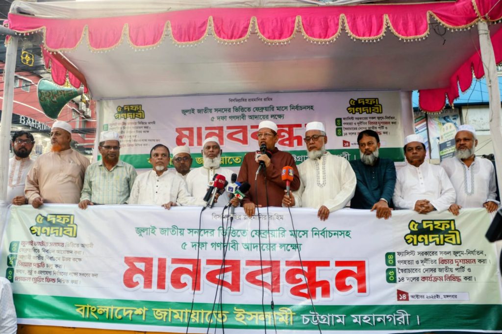 ৫ দফা গণদাবী আদায়ের লক্ষ্যে চট্টগ্রাম মহানগরী জামায়াতে উদ্যোগে আয়োজিত চট্টগ্রাম ওয়াসার মোড়ে এক মানববন্ধনে প্রধান অতিথির বক্তব্যে তিনি এসব কথা বলেন।