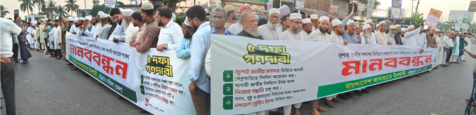৫ দফা গণদাবী আদায়ের লক্ষ্যে চট্টগ্রাম দক্ষিণ জেলা জামায়াতের উদ্যোগে কর্ণফুলীর শিকলবাহা ক্রসিংয়ে অনুষ্ঠিত মানববন্ধনে প্রধান অতিথির বক্তব্যে তিনি এসব কথা বলেন।