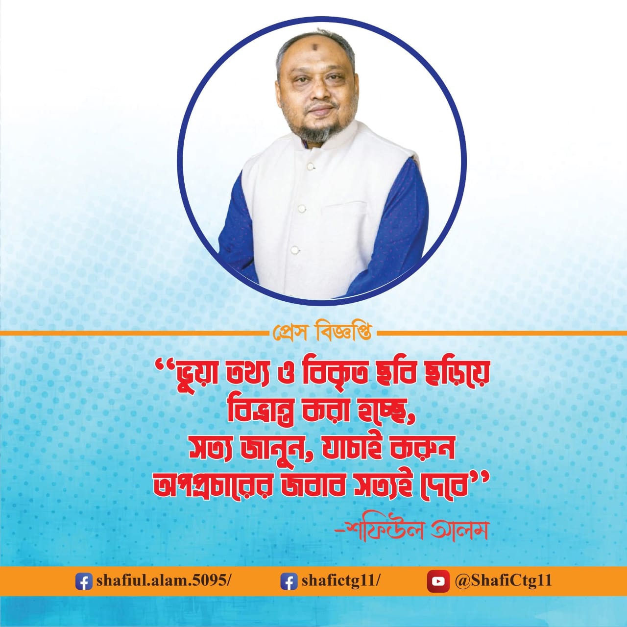 আমি স্পষ্টভাবে ঘোষণা করছি - উক্ত ফটোকার্ড বা এর সঙ্গে সংশ্লিষ্ট কোনো প্রচারণার সঙ্গে আমার কোনো সংশ্লিষ্টতা নেই। এটি সম্পূর্ণভাবে ভিত্তিহীন, উদ্দেশ্যপ্রণোদিত ও অসৎ প্রচেষ্টা, যার মাধ্যমে আমার ব্যক্তিগত ও সামাজিক ভাবমূর্তি নষ্ট করার অপচেষ্টা চলছে।