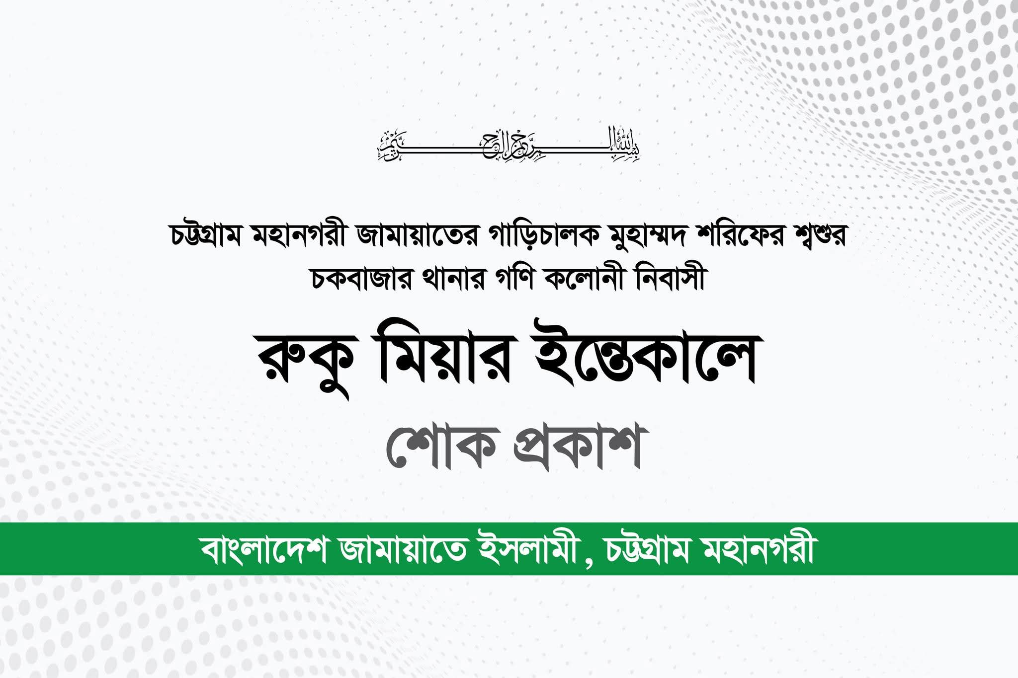 মুহাম্মদ রুকু মিয়ার ইন্তেকালে গভীর শোক জানিয়েছেন বাংলাদেশ জামায়াতে ইসলামীর কেন্দ্রীয় মজলিসে শূরার সদস্য ও চট্টগ্রাম মহানগরী জামায়াতের ভারপ্রাপ্ত আমির পরিবেশবিদ মুহাম্মদ নজরুল ইসলাম এবং নগর জামায়াতের সেক্রেটারি অধ্যক্ষ মুহাম্মদ নুরুল আমিন।