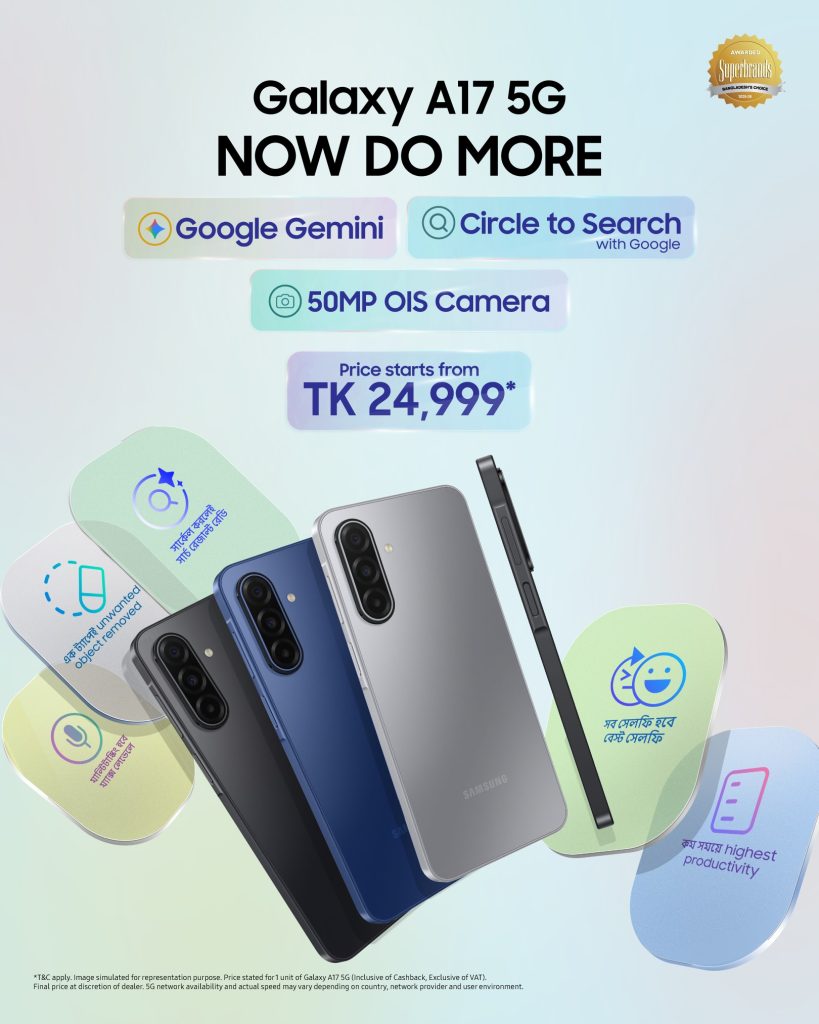 দেশচিন্তা ডেস্ক: স্যামসাং দেশের বাজারে উন্মোচন করেছে তাদের সর্বশেষ উদ্ভাবন ‘গ্যালাক্সি এ১৭ ৫জি। স্মার্টফোনটিতে ব্যবহারকারীরা ব্যবহার করতে পারবেন জেমেনাই এআই ফিচার ‘সার্কেল টু সার্চ।’ ‘অসাম ইন্টেলিজেন্স ফর এভরিওয়ান’ এ লক্ষ্যের ধারাবাহিকতায় স্যামসাং বাজারে নিয়ে এসেছে সাশ্রয়ী ৫জি এআই স্মার্টফোন – গ্যালাক্সি এ১৭ ৫জি।