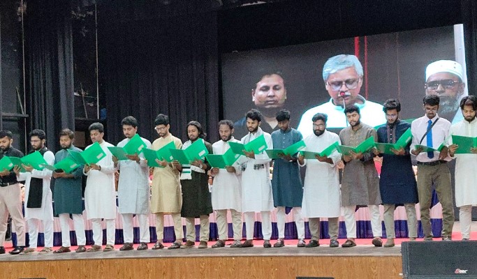 শপথ অনুষ্ঠানে অতিথিদের আসন গ্রহণ শেষে কোরআন তিলাওয়াত করেন আরবি বিভাগের শিক্ষার্থী যোবায়ের।