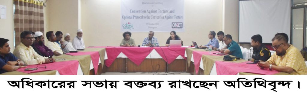 ২৫ অক্টবর (শনিবার) দুপুরে চট্টগ্রাম নগরের একটি হোটেলে মানবাধিকার সংগঠন “অধিকার’’ আয়োজিত “কনভেনশন এগেইস্ট টর্চার এণ্ড অপশনাল প্রটোকল টু দ্য কনভেনশন এগেইনস্ট টর্চা” বিষয়ক সভায় বক্তারা এসব কথা বলেন।