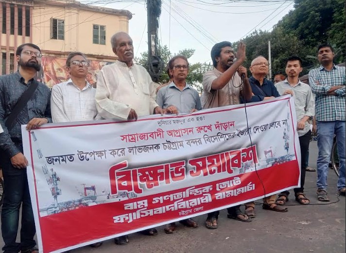দেশচিন্তা ডেস্ক: চট্টগ্রামে বাম গণতান্ত্রিক জোট ও ফ্যাসিবাদ বিরোধী বাম মোর্চার উদ্যোগে চট্টগ্রাম বন্দর বিদেশিদের ইজারা দেওয়ার প্রতিবাদে আজ ২৭ অক্টোবর ২০২৫ বিকাল ৪ টায় নগরীর সিনেমা প্যালেস চত্বরে বিক্ষোভ সমাবেশ অনুষ্ঠিত অনুষ্ঠিত হয়। বাসদ চট্টগ্রাম জেলা শাখার ইনচার্জ আল কাদেরী জয়ের সভাপতিত্বে ও বাসদ চট্টগ্রাম জেলা শাখার সদস্য আহমদ জসীমের সঞ্চালনায় এই সমাবেশে বক্তব্য রাখেন বাংলাদেশের কমিউনিস্ট পার্টি চট্টগ্রাম জেলা শাখার সহ সাধারণ সম্পাদক নূরুচ্ছফা ভূইয়া, গণমুক্তি ইউনিয়নের জেলা সভাপতি রাজা মিয়া, বাসদ (মার্ক্সবাদী) চট্টগ্রাম জেলা শাখার সদস্য জাহেদুন্নবী কনক, বাংলাদেশের সাম্যবাদী আন্দোলনের জেলা সমন্বয়ক শাহীন মঞ্জুরসহ অন্যান্য নেতৃবৃন্দ।