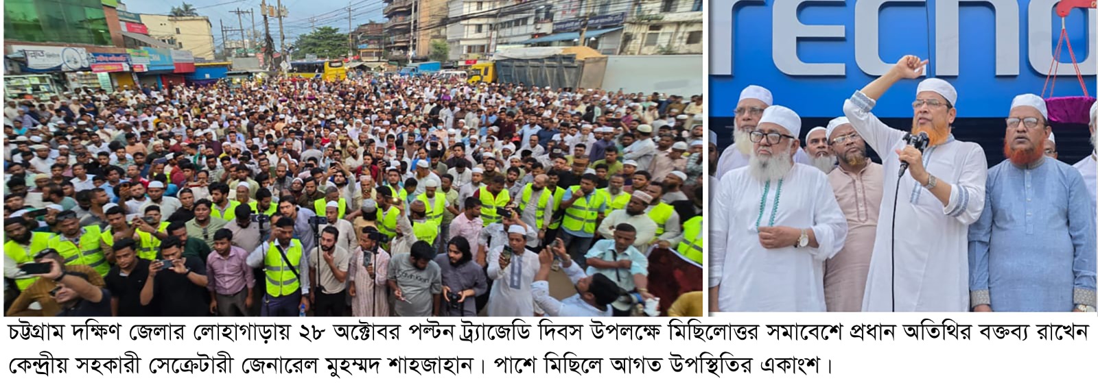 বাংলাদেশ জামায়াতে ইসলামীর সহকারী সেক্রেটারি জেনারেল মুহাম্মদ শাহজাহান বলেছেন, ২০০৬ সালের ২৮ অক্টোবর পল্টন হত্যাযজ্ঞের মাধ্যমে দেশের গণতন্ত্র, গণতান্ত্রিক মূল্যবোধ, স্বাধীনতা, সার্বভৌমত্ব ও রাষ্ট্রীয় অখণ্ডতা সহ দেশ বিরোধী ধ্বংসের পথ উন্মুক্ত করা হয়েছিলো। ২৮ অক্টোবর পল্টন হত্যাযজ্ঞ নিছক কোন হত্যাকাণ্ড ছিলো না। বরং পল্টন হত্যাকাণ্ড ছিলো গোটা বাংলাদেশকেই হত্যার শামিল। সেদিন খুনীরা শুধু হত্যা করেই ক্ষান্ত হয়নি বরং লাশের ওপর নৃত্য করে দানবীয় উল্লাসে মেতে ওঠেছিলো। সেদিনের হত্যাযজ্ঞ আইয়্যামে জাহেলিয়াতের নির্মমতার ইতিহাসকেও হার মানিয়েছে।