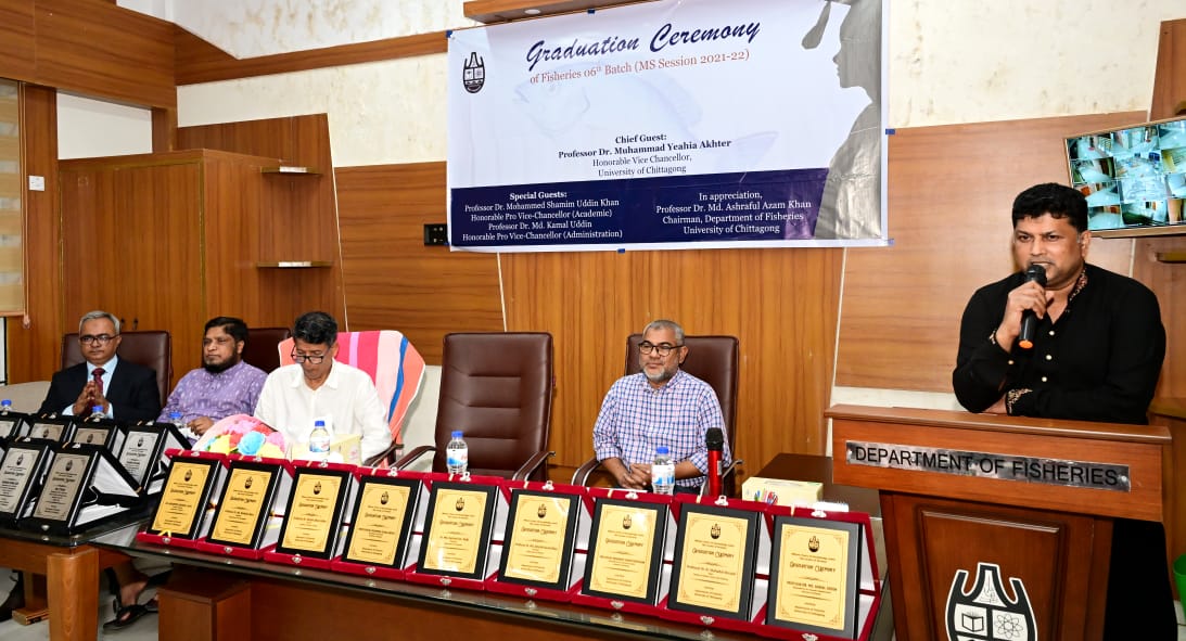 দেশচিন্তা ডেস্ক: চট্টগ্রাম বিশ্ববিদ্যালয়ের ফিশারিজ বিভাগের ষষ্ঠ ব্যাচের শিক্ষার্থীদের বিদায়ী সংবর্ধনা সোমবার (৩ নভেম্বর ২০২৫) রাত ৮টায় ফিশারিজ বিভাগে অনুষ্ঠিত হয়। এ অনুষ্ঠানে প্রধান অতিথি হিসেবে উপস্থিত ছিলেন চট্টগ্রাম বিশ্ববিদ্যালয়ের মাননীয় উপাচার্য প্রফেসর ড. মুহাম্মদ ইয়াহ্ইয়া আখতার, বিশেষ অতিথি হিসেবে উপস্থিত ছিলেন চট্টগ্রাম বিশ্ববিদ্যালয়ের মাননীয় উপ-উপাচার্য (একাডেমিক) প্রফেসর ড. মোহাম্মদ শামীম উদ্দিন খান ও মাননীয় উপ-উপাচার্য (প্রশাসন) প্রফেসর ড. মো. কামাল উদ্দিন। অনুষ্ঠানে সভাপতিত্ব করেন ফিশারিজ বিভাগের সভাপতি প্রফেসর ড. মোহাম্মদ আশরাফুল আজম খান।