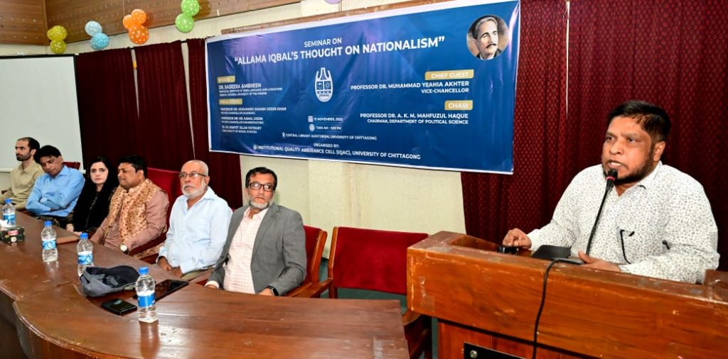 দেশচিন্তা ডেস্ক: চট্টগ্রাম বিশ্ববিদ্যালয়ের ইনস্টিটিউশনাল কোয়ালিটি এস্যুরেন্স সেলের (আইকিউএসি) উদ্যােগে “Allama Iqbal’s thought on nationalism” শীর্ষক এক সেমিনার আজ বুধবার (১২ নভেম্বর ২০২৫) সকাল ১১টায় চবি কেন্দ্রীয় গ্রন্থাগার মিলনায়তনে অনুষ্ঠিত হয়। এতে প্রধান অতিথি হিসেবে উপস্থিত ছিলেন চট্টগ্রাম বিশ্ববিদ্যালয়ের মাননীয় উপ-উপাচার্য (একাডেমিক) প্রফেসর ড. মোহাম্মদ শামীম উদ্দিন খান, বিশেষ অতিথি হিসেবে উপস্থিত ছিলেন চট্টগ্রাম বিশ্ববিদ্যালয়ের মাননীয় উপ-উপাচার্য (প্রশাসন) প্রফেসর ড. মো. কামাল উদ্দিন। চবি রাজনীতি বিজ্ঞান বিভাগের সভাপতি প্রফেসর ড. এ.কে.এম মাহফুজুল হক (মাহফুজ পারভেজ) এর সভাপতিত্বে সেমিনারে স্পিকার ছিলেন ইউনিভার্সিটি অব দ্য পাঞ্জাবের ওরিয়েন্টাল কলেজের ইনস্টিটিউট অব উর্দু ল্যাঙ্গুয়েজ এন্ড লিটারেচারের প্রফেসর ড. বশিরা আমব্রিন।