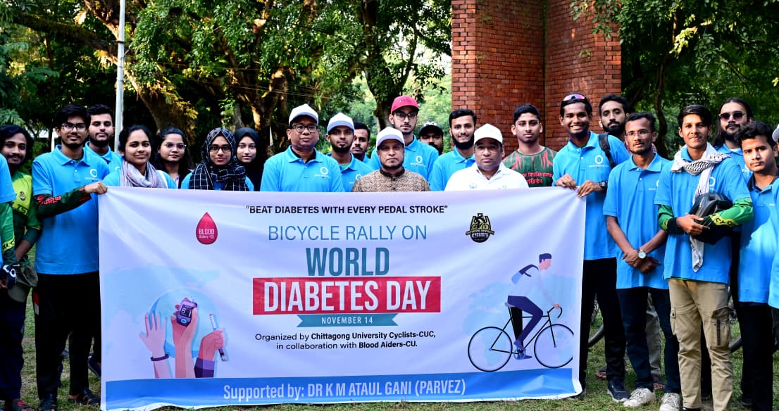 দেশচিন্তা ডেস্ক: বিশ্ব ডায়াবেটিস দিবস উপলক্ষে Chittagong University Cyclists (CUC) এবং CU Blood Aiders এর যৌথ আয়োজনে “Beat Diabetes With Every Pedal Stroke” প্রতিপাদ্যে আজ শুক্রবার (১৪ নভেম্বর ২০২৫) বিকাল ৩.৩০টায় চবি ক্যাম্পাসে একটি সচেতনতামূলক বাইসাইকেল র্যালি অনুষ্ঠিত হয়। ডায়াবেটিস প্রতিরোধে স্বাস্থ্যকর জীবনধারা, নিয়মিত ব্যায়াম এবং পরিবেশবান্ধব যাতায়াতকে উৎসাহিত করাই ছিল এ আয়োজনের মূল লক্ষ্য। অনুষ্ঠানে প্রধান অতিথি হিসেবে উপস্থিত থেকে র্যালি উদ্বোধন করেন চট্টগ্রাম বিশ্ববিদ্যালয়ের মাননীয় উপ-উপাচার্য (একাডেমিক) প্রফেসর ড. মোহাম্মদ শামীম উদ্দিন খান।