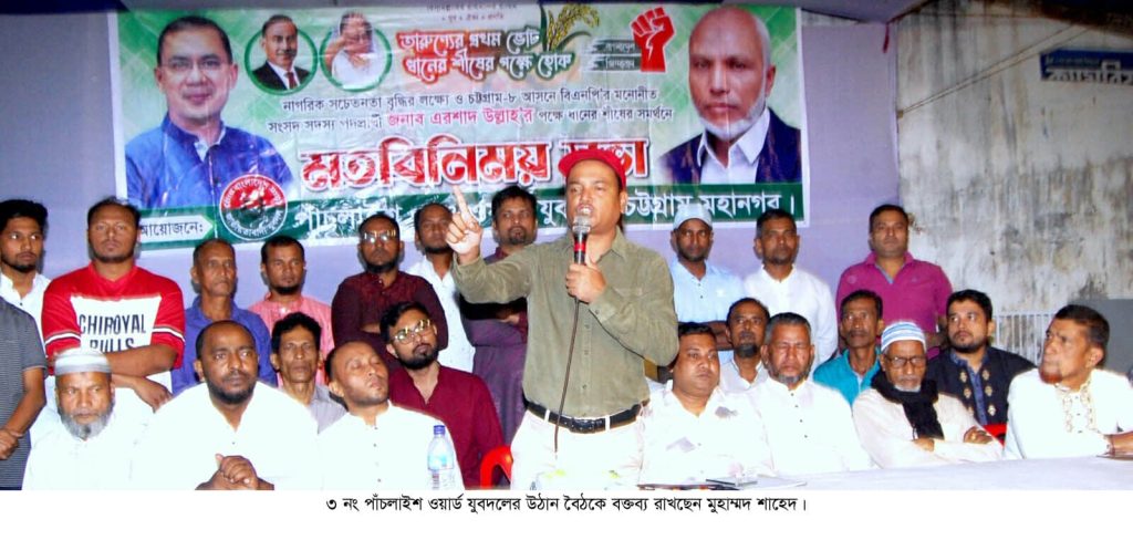 তিনি গতকাল ২১ নভেম্বর (শুক্রবার) সন্ধ্যায় ৩ নং পাঁচলাইশ ওয়ার্ড যুবদলের উদ্যোগে নাগরিক সচেতনতা বৃদ্ধি ও কেন্দ্র ভিত্তিক স্থানীয় জনগণের সাথে আগামী সংসদ নির্বাচনে বিএনপি মনোনীত চট্টগ্রাম -৮ আসনের প্রার্থী এরশাদ উল্লাহ’র ধানের শীষের সমর্থনে হাজীপাড়া এলাকায় উঠান বৈঠকে প্রধান অতিথি’র বক্তব্যে এসব কথা বলেন।