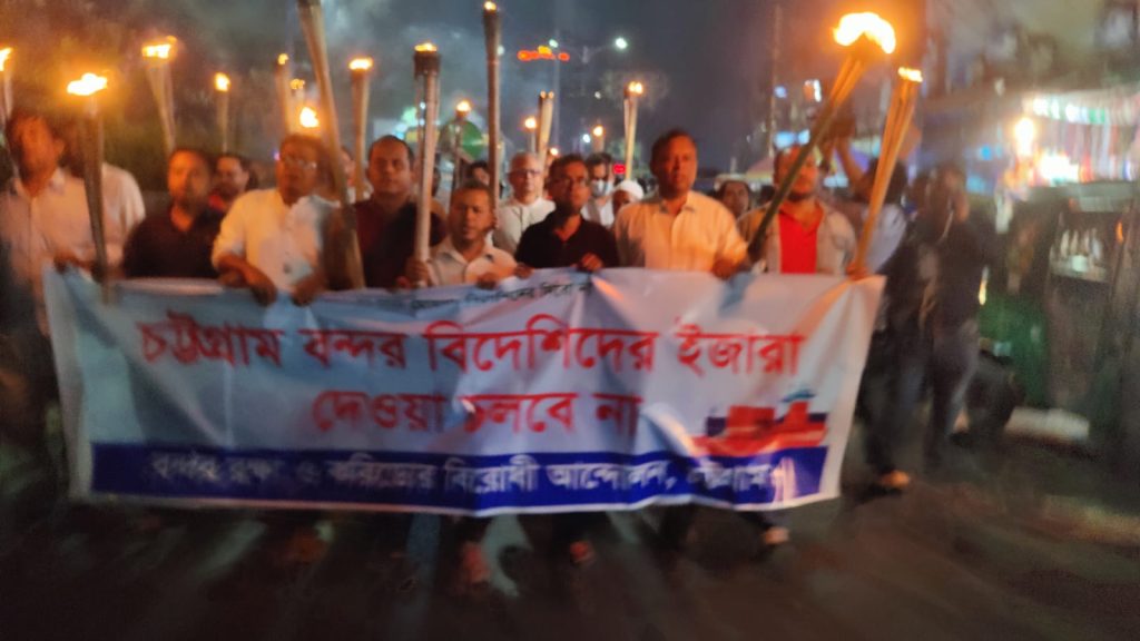 দেশচিন্তা ডেস্ক: চট্টগ্রাম বন্দরের নিউমুরিং কনটেইনার টার্মিনাল (এনসিটি), লালদিয়ার চর ও পানগাঁও টার্মিনাল বিদেশি প্রতিষ্ঠানের কাছে ইজারা দেওয়ার প্রক্রিয়া বন্ধের দাবিতে চট্টগ্রামে মশাল মিছিল ও গণসমাবেশ করেছে ‘বন্দর রক্ষা ও করিডোর বিরোধী আন্দোলন, চট্টগ্রাম’। এতে বক্তারা বন্দর রক্ষায় শ্রমিক-কর্মচারী ঐক্য পরিষদের ডাকা অবরোধ কর্মসূচিতে পূর্ণ সমর্থন ঘোষণা করে বলেছেন, দেশের সম্পদ চট্টগ্রাম বন্দর বিদেশিদের হাতে তুলে দেওয়ার এখতিয়ার অনির্বাচিত অন্তর্বর্তী সরকারের নেই। জনমত উপেক্ষা করে গায়ের জোরে অন্তর্বর্তী সরকার দেশের সম্পদ নিয়ে যেভাবে ছিনিমিনি খেলছে, এই খেলা তাদের বন্ধ করতে হবে। অন্যথায় চব্বিশের গণঅভ্যুত্থানের মতো সর্বস্তরের জনতাকে রাজপথে নেমে তাদের চক্রান্ত-ষড়যন্ত্র প্রতিহত করা হবে।