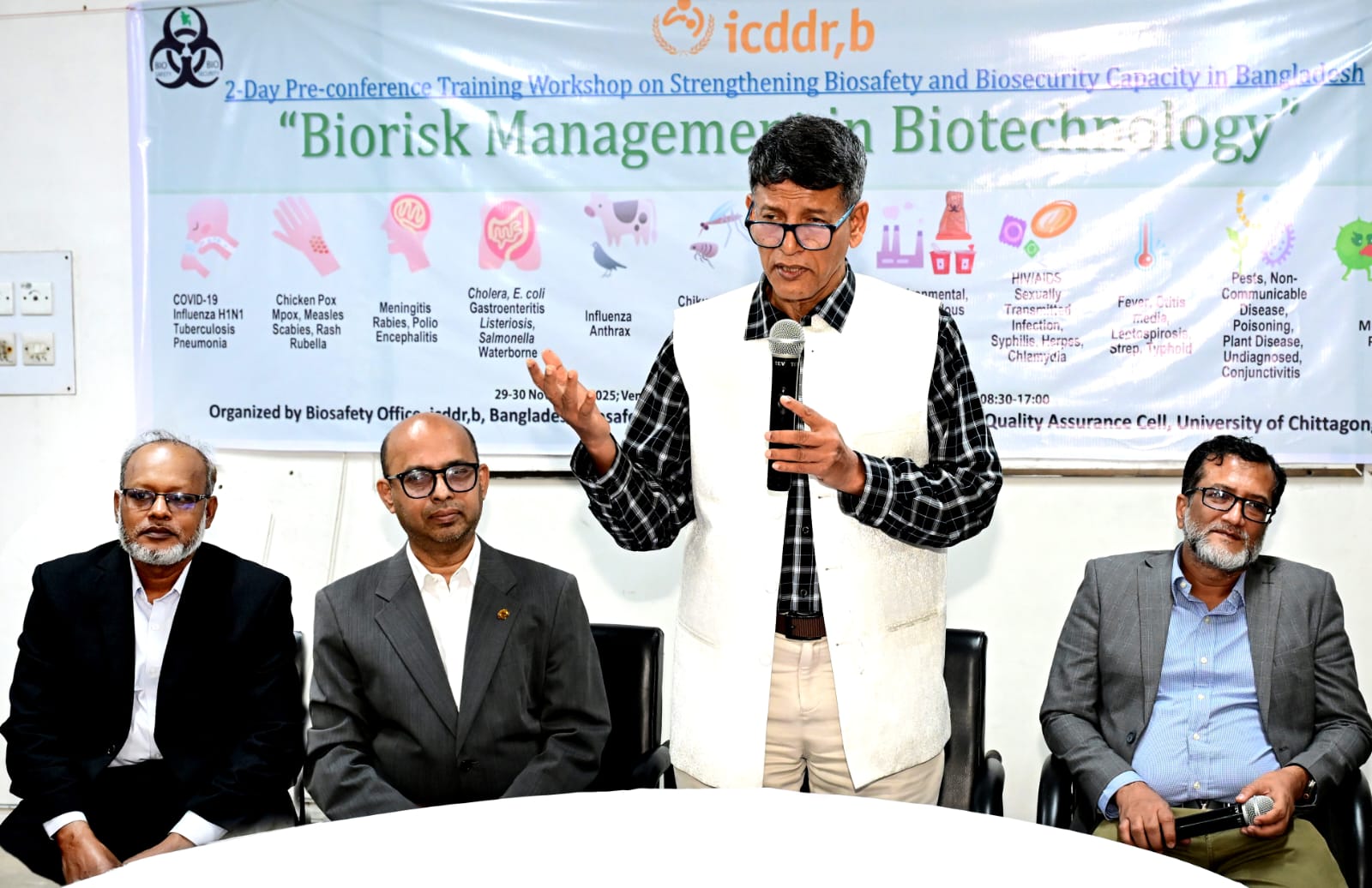 ইন্টারন্যাশনাল সেন্টার ফর ডায়রিয়াল ডিজিজ রিসার্চ, বাংলাদেশ (icddr,b)-এর বায়োসেফটি অফিস, বাংলাদেশ বায়োসেফটি অ্যান্ড বায়োসিকিউরিটি সোসাইটি এবং চট্টগ্রাম বিশ্ববিদ্যালয় ইনস্টিটিউশনাল কোয়ালিটি এস্যুরেন্স সেলের (আইকিউএসি) যৌথ উদ্যােগে ২৯ ও ৩০ নভেম্বর ২০২৫ তারিখে এই কর্মশালাটি অনুষ্ঠিত হয়। "জৈবপ্রযুক্তিতে বায়োরিস্ক ব্যবস্থাপনা" শীর্ষক কর্মশালাটির মূল লক্ষ্য ছিল গবেষণাগার এবং স্বাস্থ্যসেবা কেন্দ্রে জৈব-ঝুঁকি (Biorisk) নিয়ন্ত্রণের আধুনিক কৌশল নিয়ে আলোচনা করা। এতে বিভিন্ন মারাত্মক রোগ, যেমন কোভিড-১৯, যক্ষ্মা, কলেরা, ডেঙ্গু, ম্যালেরিয়া, ইবোলা এবং অ্যান্টিমাইক্রোবিয়াল রেজিস্ট্যান্স (AMR) এর মতো জনস্বাস্থ্য চ্যালেঞ্জগুলো কীভাবে নিরাপদভাবে মোকাবিলা করা যায়, তা হাতে-কলমে শেখানো হয়। এছাড়া, পরিবেশগত ও বায়োহ্যাজার্ডাস বর্জ্য ব্যবস্থাপনার উপরও জোর দেওয়া হয়।