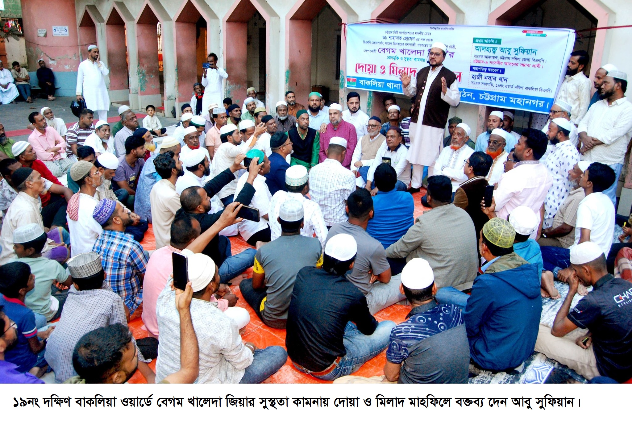 সোমবার (১ ডিসেম্বর) বাদ আসর ১৯নং দক্ষিণ বাকলিয়া ওয়ার্ডের চাক্তাই তুলাতলি এলাকাস্থ বায়তুন নুর জামে মসজিদে বিএনপির চেয়ারপার্সন, সাবেক প্রধানমন্ত্রী ও আপসহীন দেশনেত্রী বেগম খালেদা জিয়ার রোগমুক্তি, সুস্থতা ও দীর্ঘায়ু কামনায় বাকলিয়া থানা বিএনপি, অঙ্গ ও সহযোগী সংগঠনের উদ্যোগে আয়োজিত “দোয়া ও মিলাদ মাহফিলে” প্রধান অতিথির বক্তব্যে তিনি এসব কথা বলেন। দোয়া ও মিলাদ মাহফিলে দেশনেত্রী বেগম খালেদা জিয়ার সুস্থতা ও দীর্ঘায়ু কামনা করে বিশেষ দোয়া ও মোনাজাত করা হয়।