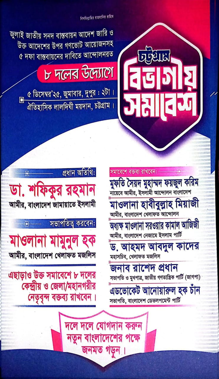 দেশচিন্তা ডেস্ক: জুলাই জাতীয় সনদ বাস্তবায়ন আদেশ জারি ও উক্ত আদেশের উপর গণভোট আয়োজনসহ ৫ দফা বাস্তবায়নের দাবীতে ৮ দলের উদ্যোগে চট্টগ্রাম বিভাগীয় সমাবেশ আগামীকাল ৫ ডিসেম্বর-২০২৫ইং জুমাবার বিকাল-২টা, ঐতিহাসিক লালদীঘির ময়দানে অনুষ্ঠিত হবে। উক্ত সমাবেশে জাতীয় নেতৃবৃন্দের মধ্যে জাতির উদ্দেশ্যে বক্তব্য রাখবেন বাংলাদেশ জামায়াতে ইসলামীর আমির ডা. শফিকুর রহমান, ইসলামী আন্দোলন বাংলাদেশের সিনিয়র নায়াবে আমির (শায়েখে চরমোনাই) মুফতি সৈয়দ মুহাম্মদ ফয়জুল করিম, বাংলাদেশ খেলাফত মজলিসের আমির আল্লামা মামুনুল হক, বাংলাদেশ নেজামে ইসলাম পার্টির আমির অধ্যক্ষ মাওলানা সরওয়ার কামাল আজিজী, খেলাফত মজলিসের মহাসচিব ড. আহমদ আবদুল কাদের, জাতীয় গণতান্ত্রিক পার্টির (জাগপা) সহ-সভাপতি ও মুখপাত্র ইঞ্জিনিয়ার রাশেদ প্রধান, বাংলাদেশ খেলাফত আন্দোলনের আমির মাওলানা হাবীবুল্লাহ মিয়াজী, বাংলাদেশ ডেভেলপমেন্ট পার্টির চেয়ারম্যান এডভোকেট এ কে এম আনোয়ারুল ইসলাম চানসহ নেতৃবৃন্দ।