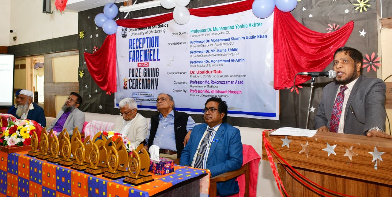 দেশচিন্তা ডেস্ক: চট্টগ্রাম বিশ্ববিদ্যালয়ের পরিসংখ্যান বিভাগের নবীন বরণ, বিদায় ও পুরস্কার বিতরণ আজ মঙ্গলবার (৯ ডিসেম্বর ২০২৫) বেলা ১০টায় চবি বিজ্ঞান অনুষদের গ্যালারিতে অনুষ্ঠিত হয়। এতে প্রধান অতিথি হিসেবে উপস্থিত ছিলেন চট্টগ্রাম বিশ্ববিদ্যালয়ের মাননীয় উপাচার্য প্রফেসর ড. মুহাম্মদ ইয়াহ্ইয়া আখতার, বিশেষ অতিথি হিসেবে উপস্থিত ছিলেন চট্টগ্রাম বিশ্ববিদ্যালয়ের মাননীয় উপ-উপাচার্য (একাডেমিক) প্রফেসর ড. মোহাম্মদ শামীম উদ্দিন খান, মাননীয় উপ-উপাচার্য (প্রশাসন) প্রফেসর ড. মো. কামাল উদ্দিন ও চবি বিজ্ঞান অনুষদের ডিন প্রফেসর ড. মোহাম্মদ আল-আমীন। অনুষ্ঠানে গেস্ট অব অনার ছিলেন চবি পরিসংখ্যান এলামনাই এসোসিয়েশনের সভাপতি ড. উবাইদুর রব।