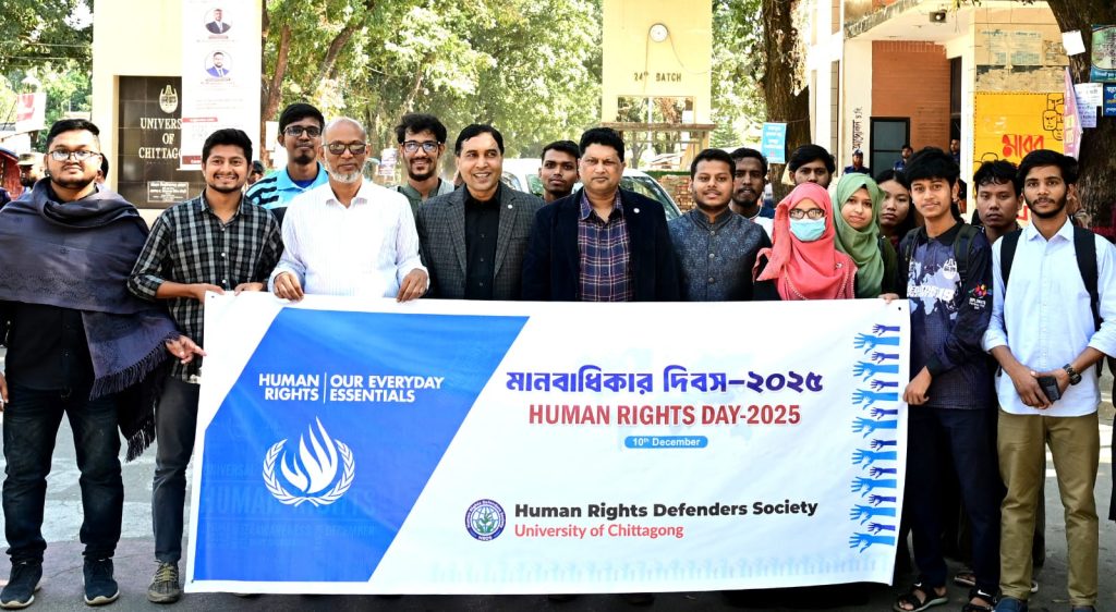 দেশচিন্তা ডেস্ক: চট্টগ্রাম বিশ্ববিদ্যালয় শাখা হিউম্যান রাইটস ডিফেন্ডার সোসাইটি (এইচআইডিএস) এর উদ্যোগে বুধবার (১০ ডিসেম্বর ২০২৫) বেলা ১১টায় ‘বিশ্ব মানবাধিকার দিবস ২০২৫’ উদযাপন করা হয়। এ উপলক্ষে একটি র্যালি বিশ্ববিদ্যালয়ের জিরো পয়েন্ট থেকে শুরু হয়ে কাটা পাহাড় হয়ে শহীদ মিনার প্রাঙ্গণে শেষ হয়। এরপর সংক্ষিপ্ত সমাবেশের মাধ্যমে অনুষ্ঠান শেষ হয়।