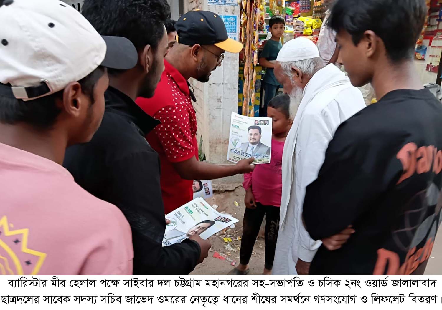 দেশচিন্তা ডেস্ক: চট্টগ্রাম-৫ সংসদীয় আসনে, বিএনপি’র মনোনীত’ ধানের শীষের সংসদ সদস্য” পদপ্রার্থী, ব্যারিস্টার মীর মোহাম্মদ হেলাল উদ্দিন ভাইয়ের পক্ষে বাংলাদেশ জাতীয়তাবাদী সাইবার দল চট্টগ্রাম মহানগরের সহ-সভাপতি ও চসিক ২নং ওয়ার্ড জালালাবাদ ছাত্রদলের সাবেক সদস্য সচিব জাভেদ ওমরের নেতৃত্বে জেলা পরিষদ আবাসিক, শীতল ঝর্ণ আবাসিক এলাকার বাসা বাড়িতেসহ আশপাশের বিভিন্ন স্থানে ব্যারিস্টার মীর মোহাম্মদ হেলাল উদ্দিন ধানের শীষের সমর্থনে গণসংযোগ ও লিফলেট বিতরণ। এতে আরো উপস্থিত ছিলেন মহানগর ছাত্রদলের সাবেক সহ-সাংগঠনিক সম্পাদক এম আর আই সাইমুম রুবেল, জাতীয়তাবাদী সাইবার দল বায়েজিদ বোস্তামী থানার ২নং জালালাবাদ ওয়ার্ড নেতা মুহাম্মদ তামিম, তৌসিফ চৌধুরী, সাকিব আহমেদ,তাকবির চৌধুরী, মুহাম্মদ ফইসাল, নিজাম উদ্দিন সামী সহ-নেতৃবৃন্দ প্রমুখ।