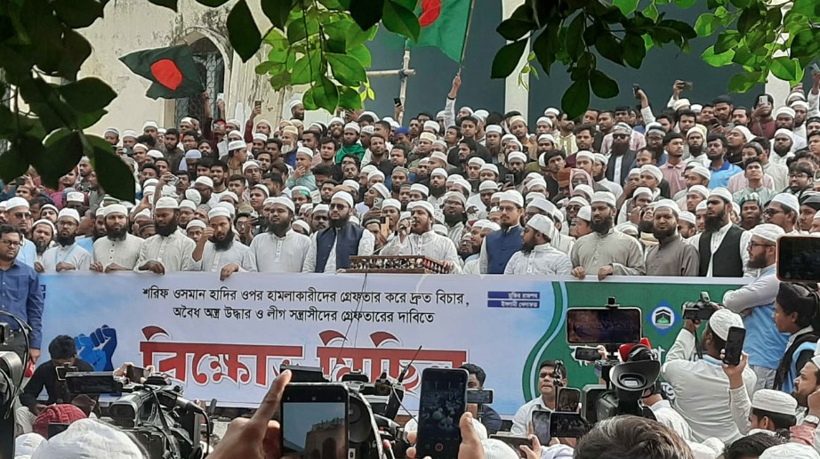 শুক্রবার (১৯ ডিসেম্বর) জুমার নামাজ শেষে ‘শরিফ ওসমান হাদির ওপর হামলাকারীদের গ্রেফতার করে দ্রুত বিচার, অবৈধ অস্ত্র উদ্ধার ও লীগ সন্ত্রাসীদের গ্রেফতারের দাবিতে’ শীর্ষক ব্যানারে বিক্ষোভ কর্মসূচি শুরু হয়।