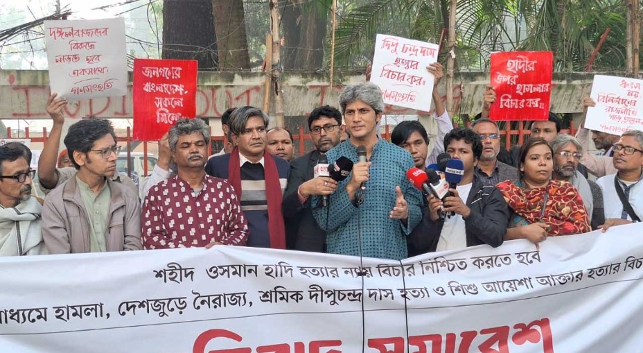 জোনায়েদ সাকি বলেন, ‘ওসমান হাদিকে হত্যা করা হয়েছে এবং তার শাহাদাতের মধ্য দিয়ে মানুষের মধ্যে শোক এবং ক্ষোভের জন্ম হয়েছে। আজকে বাংলাদেশের মানুষ ওসমান হাদির হত্যার বিচার চায়। মানুষ ক্ষুব্ধ এবং এই ক্ষোভকে কাজে লাগিয়ে একদল গোষ্ঠী তাদের নিজস্ব রাজনৈতিক লক্ষ্য পতিত ফ্যাসিস্টদের দেখিয়ে, গণতন্ত্রের পথে না হেঁটে, তারা নিজেরা আরেকটা ফ্যাসিবাদী গোষ্ঠী হয়ে উঠতে চায়। তারা নিজেরা আরেকটি মতাদর্শ জবরদস্তি কায়দায় চাপিয়ে দেওয়ার রাজনৈতিক শক্তি হয়ে উঠতে চায়। এজন্য তারা বিশেষ লক্ষ্য নিয়ে সংবাদ মাধ্যমও সাংস্কৃতিক সংগঠনে হামলা করছে। তারা রাতের বেলায় ঘোষণা দিয়ে পত্রিকা অফিস পুড়িয়ে দিচ্ছে। আমরা দেখলাম সরকার সেক্ষেত্রেও রহস্যজনকভাবে নীরব। সরকারের কোন কোন উপদেষ্টা সেখানে গিয়েছেন এবং কি দায়িত্ব পালন করেছেন? সেই জবাবদিহি সরকারকে করতে হবে। যারা ভয়ের রাজত্ব কায়েম করতে চায়, সরকার কি সেটাকে পৃষ্ঠপোষকতা দিচ্ছে?’