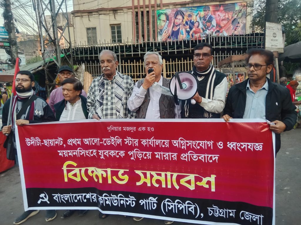 দেশচিন্তা ডেস্ক: উদীচী, ছায়ানট, দৈনিক প্রথম আলো ও ডেইলি স্টার কার্যালয়ে অগ্নিসংযোগ-ধ্বংসযজ্ঞ এবং ময়মনসিংহে যুবককে পুড়িয়ে মারার প্রতিবাদে চট্টগ্রামে বিক্ষোভ সমাবেশ ও মিছিল করেছে বাংলাদেশের কমিউনিস্ট পার্টি (সিপিবি)। এতে সিপিবির প্রাক্তন কেন্দ্রীয় সভাপতি মোহাম্মদ শাহআলম বলেছেন, নির্বাচন বানচালের ষড়যন্ত্রের অংশ হিসেবে সরকারের ভেতরের কারও কারও ইন্ধনে দেশবিরোধী উগ্রবাদী গোষ্ঠী এ ধ্বংসাত্মক খেলায় মেতেছে।