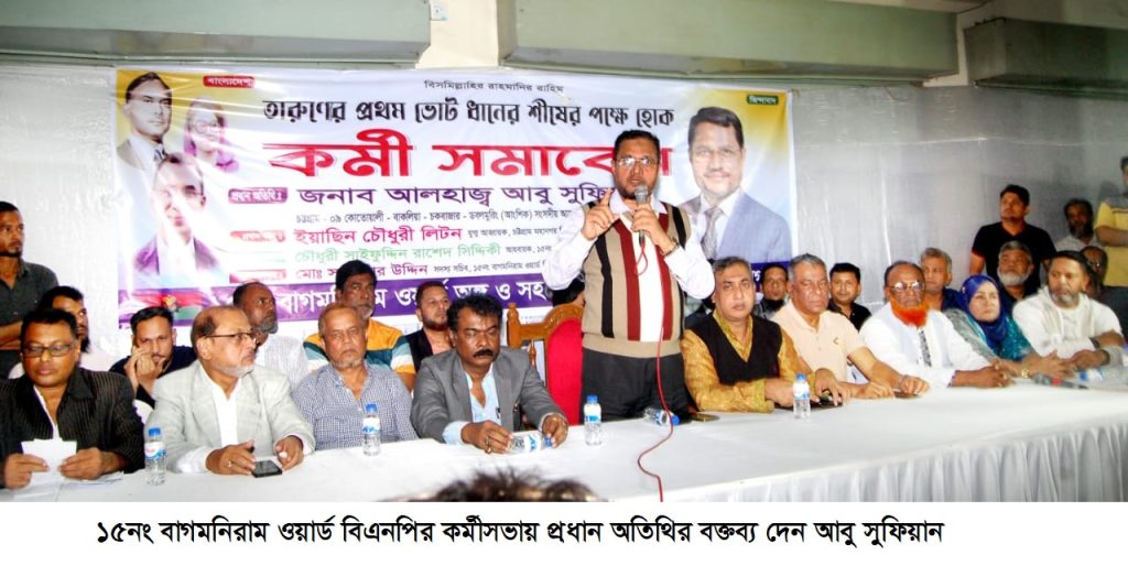 ১৫নং বাগমনিরাম ওয়ার্ড বিএনপির আহবায়ক চৌধুরী সাইফুদ্দিন সিদ্দিকী রাশেদ এর সভাপতিত্বে কর্মীসভায় প্রধান বক্তার বক্তব্য দেন চট্টগ্রাম মহানগর বিএনপির যুগ্ম আহবায়ক ইয়াছিন চৌধুরী লিটন। বিশেষ অতিথির বক্তব্য রাখেন মহানগর বিএনপির সাবেক যুগ্ম সম্পাদক আনোয়ার হোসেন লিপু, মহানগর মহিলাদলের সভাপতি মনোয়ারা বেগম মনি, এড. আবুল কাশেম চৌধুরী, শামসুল আনোয়ার খান। বক্তব্য দেন চকবাজার থানা বিএনপির সাবেক সাধারণ সম্পাদক নুর হোসাইন, শফিকুল ইসলাম খোকন, নকিব উদ্দিন ভূইয়া, মো. সরোয়ার, মো. ইসহাক, বেলায়েত হোসেন, মুছা মিয়া তালুকদার, মো. ইলিয়াছ, নিজাম উদ্দিন, মো. সেকান্দর, মো. শাহাজাহান, আনোয়ার হোসেন আনু, ফজর আলী, মো. মামুন, কুতুবউদ্দিন, তপন চৌধুরী, দেবু চৌধুরী, নাছির উদ্দিন প্রমুখ।