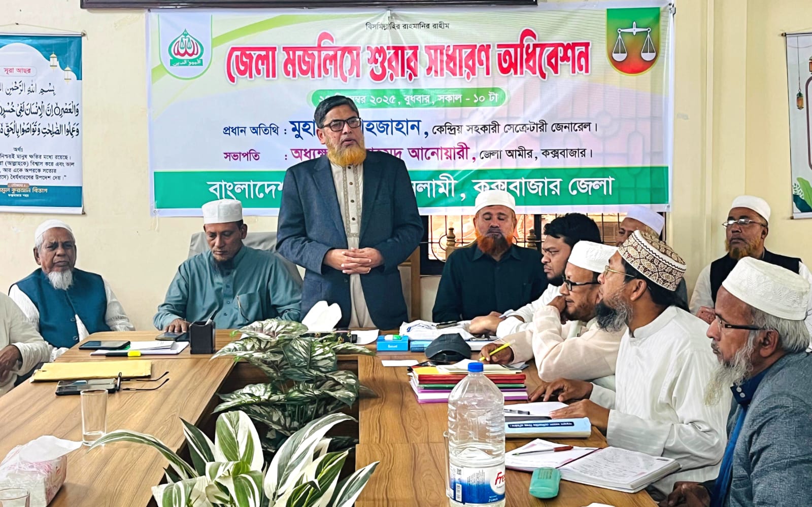 দেশচিন্তা ডেস্ক: বাংলাদেশ জামায়াতে ইসলামী কক্সবাজার জেলা মজলিসে শূরার সাধারণ অধিবেশন ২৪ ডিসেম্বর সকাল ১০ টায় হাসপাতাল সড়কস্থ দলীয় কার্যালয়ে অনুষ্ঠিত হয়। জেলা আমীর অধ্যক্ষ মাওলানা নূর আহমদ আনোয়ারীর সভাপতিত্বে অনুষ্ঠিত অধিবেশনে প্রধান অতিথি হিসেবে উপস্থিত ছিলেন বাংলাদেশ জামায়াতে ইসলামীর সহকারী সেক্রেটারি জেনারেল মুহাম্মদ শাহজাহান।