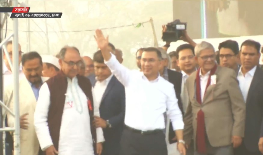 ঢাকার হযরত শাহজালাল আন্তর্জাতিক বিমানবন্দর থেকে বৃহস্পতিবার (২৫ ডিসেম্বর) বিকেল ৩টা ৫০ মিনিটে সেখানে পৌঁছায় তারেক রহমানের বহনকারী বাসটি। এরপর বাস থেকে নেমে মঞ্চে ওঠেন তিনি।