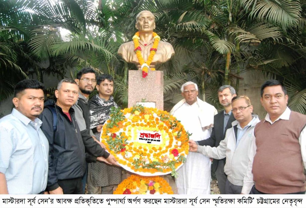 দেশচিন্তা ডেস্ক: মাস্টারদা সূর্য সেন স্মৃতিরক্ষা কমিটি’ চট্টগ্রাম’র উদ্যোগে মাস্টারদা’র ৯২তম ফাঁসি দিবস স্মরণে জে. এম. সেন হল প্রাঙ্গণে আজ ১২ জানুয়ারী সকাল ০৯টায় মাস্টারদা সূর্য সেন’র আবক্ষ প্রতিকৃতিতে পুষ্পার্ঘ্য অর্পণ করা হয়। এসময় উপস্থিত ছিলেন সংগঠনের সাধারণ সম্পাদক তাপস হোড়, হরিপদ চৌধুরী বাবুল, বিকাশ মজুমদার, মোপলেস’র সভাপতি সজল চৌধুরী, সাজিদুল হক হাসান, চট্টগ্রাম দক্ষিণ জেলা যুব ঐক্য পরিষদের সভাপতি এড. সুমন সরকার, সাধারণ সম্পাদক গৌতম দাশ, সাংগঠনিক সম্পাদক সজীব দত্ত সৌরভ, এড. সুজন চক্রবর্তী, শাপলু মিত্র প্রমুখ।
