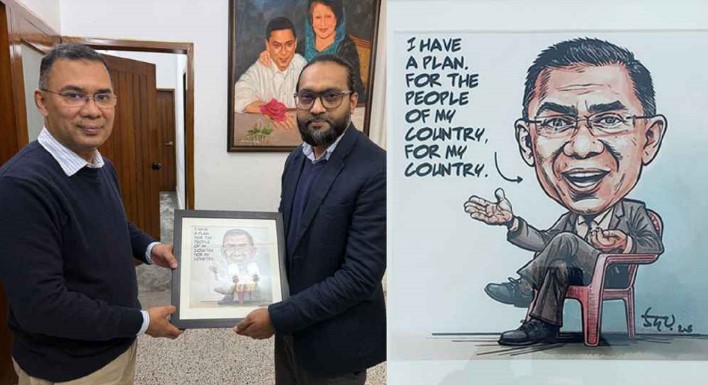 দেশচিন্তা ডেস্ক: বাংলাদেশ জাতীয়তাবাদী দলের (বিএনপি) চেয়ারম্যান তারেক রহমানের হাতে তার একটি কার্টুন উপহার হিসেবে তুলে দিয়েছেন জনপ্রিয় কার্টুনিস্ট উদয়।