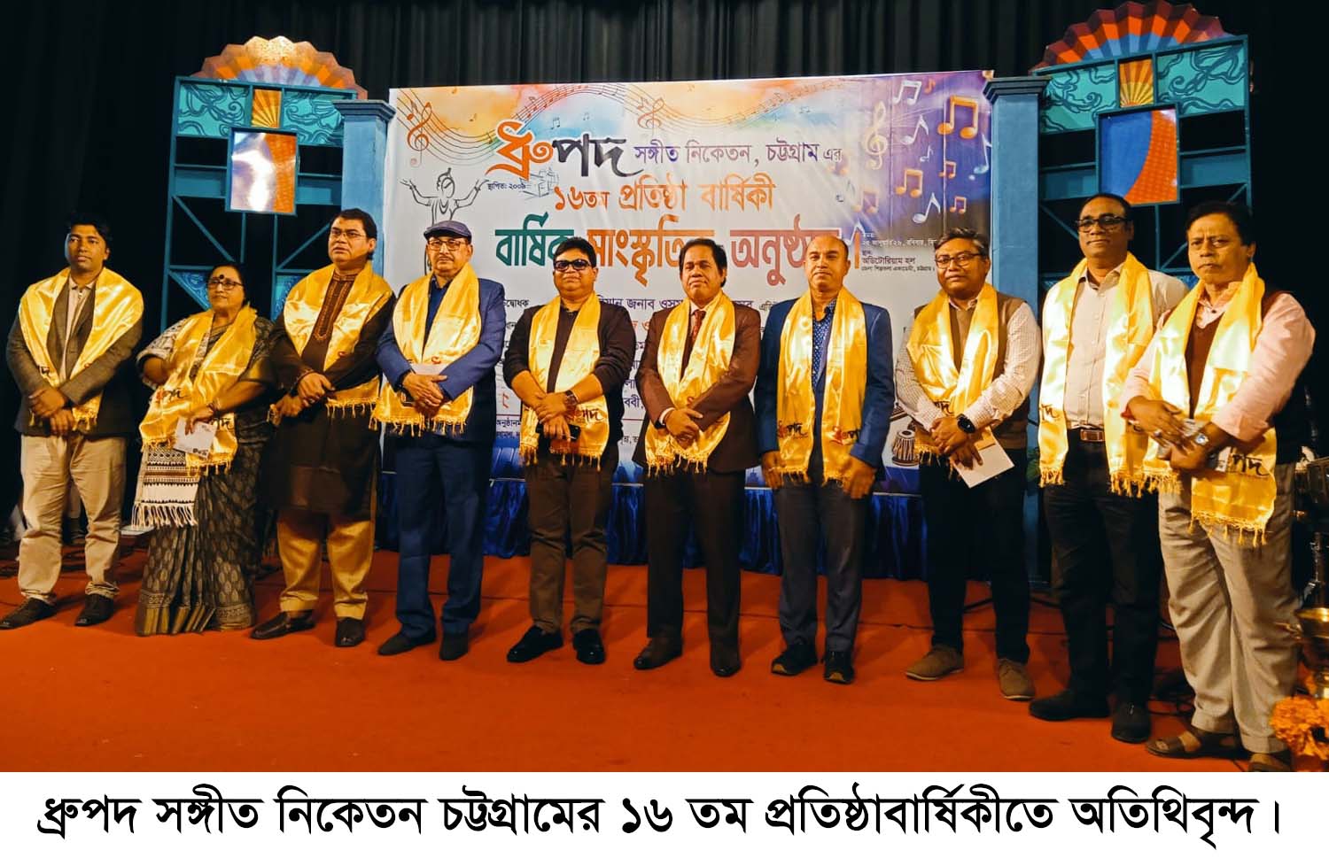 দেশচিন্তা ডেস্ক: ধ্রুপদ সঙ্গীত নিকেতন চট্টগ্রামের উদ্যোগে সংগঠনের ১৬ তম প্রতিষ্ঠাবার্ষিকী উপলক্ষে এক আলোচনা সভা, বার্ষিক সাংস্কৃতিক অনুষ্ঠান ও পুরষ্কার বিতরণ গতকাল ২৫শে জানুয়ারী সন্ধ্যায় চট্টগ্রাম জেলা শিল্পকলা একাডেমী মিলনায়তনে অনুষ্ঠিত হয়। সংস্থার পরিচালক উজ্জ্বল চন্দ্র নাথের সভাপতিত্বে উক্ত সভার উদ্ভোধন করেন দি ডেইলি পিপলস ভিউ সম্পাদক রোটারিয়ান ওসমান গণি মনসুর। এতে প্রধান অতিথি হিসেবে উপস্থিত ছিলেন বিশিষ্ট শিল্পোদ্যোক্তা রিয়াজ ওয়ায়েজ। অনুষ্ঠানের মঙ্গল প্রদীপ প্রজ্জ্বলন করেন সংস্থার উপদেষ্ঠা চিনু চৌধুরী। এতে বিশেষ অতিথি হিসেবে উপস্থিত ছিলেন মুক্তধারা টেকনোলজি লিঃ এর চেয়ারম্যান পার্থ প্রতীম দাশ। এতে আলোকিত অতিথি হিসেবে উপস্থিত ছিলেন জেলাশিল্পকলা একাডেমী চট্টগ্রামের কালচারাল অফিসার সৈয়দ মুহাম্মদ আয়াজ মাবুদ, খেলাঘর সংগঠক, অধ্যাপিকা শীলা দাশ গুপ্তা, বিশিষ্ট নৃত্যশিল্পী সঞ্চিতা দত্ত বেবী, বিশিষ্ট বাচিকশিল্পী প্রবীর পাল, ডাঃ দিপেন বৈদ্য, গিটারিস্ট রাজীব চৌধুরী, মঞ্জুরুল হক, নবযাত্রা সভাপতি গিটারিষ্ট দুর্জয় পাল, তবলা বাদক পলাশ দেব, সংস্কৃতিকর্মী এডভোকেট ফোরকান রাসেল। স্বাগত বক্তব্য রাখেন ধ্রুপদ সঙ্গীত নিকেতনের পরিচালক উৎপল চন্দ্র নাথ। অনুষ্ঠান সঞ্চালনা করেন নৃত্যশিল্পী রিয়া দাশ, চায়না ও আবৃত্তিশিল্পী অনুপমা দাশ। সভা শেষে সাংস্কৃতিক প্রতিযোগিতায় বিজয়ীদের মাঝে পুরষ্কার বিতরণ করেন অতিথিবৃন্দ। অনুষ্ঠানের দলীয়, একক গান, নৃত্য, আবৃত্তি ও গিটার পরিবেশন করেন ধ্রুপদ সঙ্গীত নিকেতন চট্টগ্রামের শিল্পীবৃন্দ। সভার উদ্ভোধন ওসমান গণি মনসুর বলেন শিশু কিশোরদের মেধা, মনন আরো বেশি জাগ্রত করতে সাংস্কৃতিক চর্চার বিকল্প। কেননা সঙ্গীত অনুশীলনই পারে আমাদের হৃদয়াবৃত্তিকে আরো বেশি বিকশিত করতে। সভার প্রধান অতিথি রিয়াজ ওয়ায়েজ বলেন শিশু কিশোরদেরকে জিপিএ ৫ এর অসম প্রতিযোগিতায় টেলে না দিয়ে তাদেরকে পরিশুদ্ধ সাংস্কৃতিক চর্চার মাধ্যমে তাদের সুপ্ত প্রতিভাকে প্রকাশ করার সুযোগ দিতে হবে। তিনি ধ্রুপদ সঙ্গীত নিকেতন চট্টগ্রাম সঙ্গীত অনুশীলনে ১৬ বছরের পথচলা স্বাগতম জানান। তিনি বলেন বাঙালী সংস্কৃতিকে আরোবেশি বিশ্বায়ন করতে আমাদের আগামী প্রজন্ম সঙ্গীত তথা সংস্কৃতিমুখী করতে হবে।