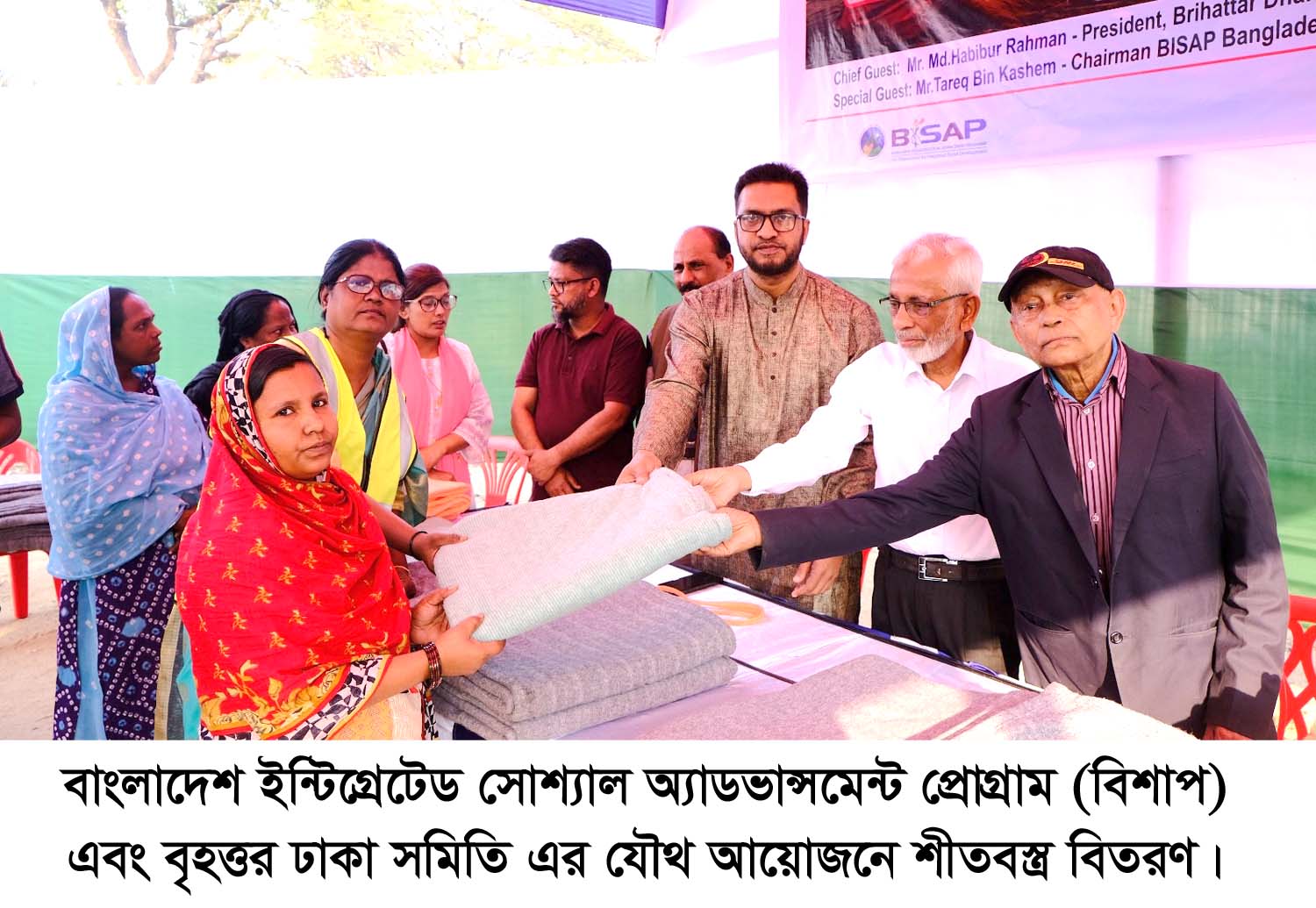 দেশচিন্তা ডেস্ক: বাংলাদেশ ইন্টিগ্রেটেড সোশ্যাল অ্যাডভান্সমেন্ট প্রোগ্রাম (বিশাপ) এবং বৃহত্তর ঢাকা সমিতি এর যৌথ আয়োজনে গত ২৬ জানুয়ারি, খুলশী ওয়ার্ড নং-১৩ এর সেগুন বাগান নিবেদন ক্লাব (ত্রিভুজ মাঠ)-এ এক শীতবস্ত্র বিতরণ অনুষ্ঠান অনুষ্ঠিত হয়। উক্ত অনুষ্ঠানে প্রায় ২৫০ জন দুস্থ ও শীতার্ত মানুষের মাঝে কম্বল বিতরণ করা হয়। অনুষ্ঠানে প্রধান অতিথি হিসেবে উপস্থিত ছিলেন বৃহত্তর ঢাকা সমিতি, চট্টগ্রাম এর সভাপতি লায়ন মো. হাবিবুর রহমান। অনুষ্ঠানে সভাপতিত্ব করেন বিশাপ’র প্রধান নির্বাহী এস. এম. তারেক জাবেদ। বিশেষ অতিথি হিসেবে উপস্থিত ছিলেন বিশাপ বাংলাদেশ’র চেয়ারম্যান তারেক বিন কাসেম, কনজ্যুমার রাইটস অব বাংলাদেশ-এর প্রতিনিধি কে.জি.এম. সবুজ, সংগঠনের প্রচার সম্পাদক হাফেজ মুহাম্মদ আনোয়ার হোসেন, অফিস সেক্রেটারি দিলীপ কুমার সুর। অনুষ্ঠান পরিচালনায় ছিলেন শাহজাদ মাজিদসহ বিভিন্ন সামাজিক ব্যক্তিত্ব, কমিউনিটি নেতা ও গণ্যমান্য অতিথিবৃন্দ। অনুষ্ঠানের সার্বিক তত্ত্বাবধানে ছিলেন বিসাপ-এর টিম সদস্য ও স্বেচ্ছাসেবকবৃন্দ ।