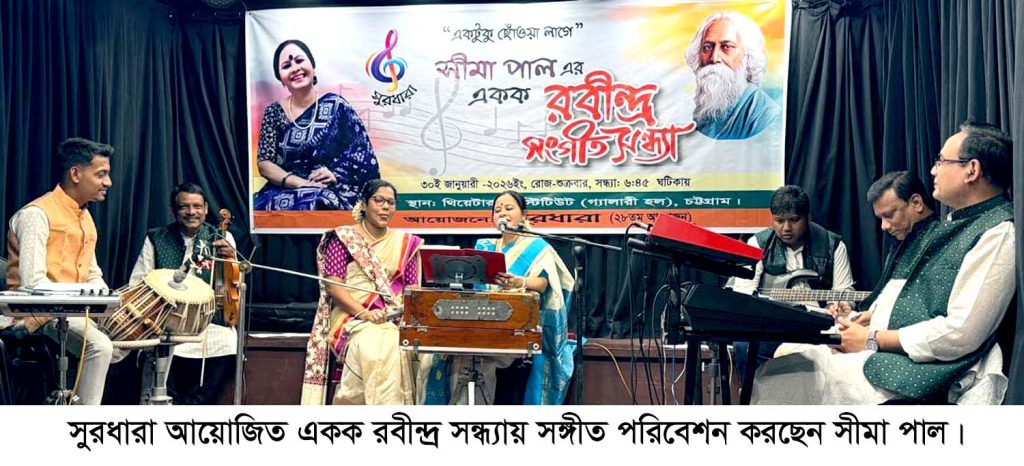 সুরধারার ২৮তম আয়োজন উপলক্ষে সীমা পালের একক রবীন্দ্র সঙ্গীত সন্ধ্যা ও সঙ্গীতশিল্পী এড. শুভাগত চৌধুরীর সাথে শিল্পীর ৬টি দ্বৈত সঙ্গীত অনুষ্ঠান গত ৩০ শে জানুয়ারী সন্ধ্যায় চট্টগ্রাম থিয়েটার ইনস্টিটিউট মিলনায়তনে অনুষ্ঠিত হয়। এড. অর্পিতা দাশের সঞ্চালনায় এতে অতিথি হিসেবে বক্তব্য রাখেন সঙ্গীতশিল্পী অধ্যাপিকা মৃণালিনী চক্রবর্তী।