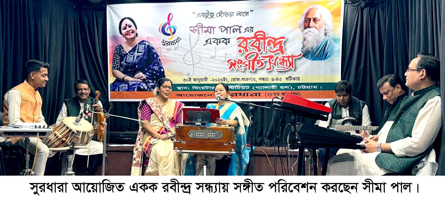 অনুষ্ঠানে স্বাগত বক্তব্য রাখেন সুরধারার পরিচালক এড. শুভাগত চৌধুরী। যন্ত্র সঙ্গীতে ছিলেন কি-বোর্ডে নিখিলেশ বড়ুয়া, তবলায় শ্রাবণ চক্রবর্তী, বেজগিটারে তন্ময় বড়ুয়া, অক্টোপ্যাডে অনুজিত বড়ুয়া, বেহালায় শ্যামল দাশ প্রমুখ। এতে শিল্পী সীমা পাল অন্তরে জগিছ, অন্তর, আমার জীবন পাত্র, গহন কুসুম কুঞ্জে মাঝেসহ পর পর ১৮ টি রবীন্দ্র সঙ্গীত পরিবেশন করেন। সম্মানিত অতিথি মৃণালিনী চক্রবর্তী তার বক্তব্যে বলেন সঙ্গীতশিল্পী সীমা পাল তার হৃদয় থেকে রবীন্দ্র সঙ্গীত চর্চা করে যাচ্ছে। এটাই শিল্পীর আদর্শ হওয়া।একজন শিল্পী সবসময় একজন শিক্ষার্থী।সঙ্গীত মানে ধ্যান, অনুশীলন। তাই সঙ্গীতের চর্চা চলমান রাখা জরুরী। তিনি শিল্পীর উত্তোরত্তর সাফল্য কামনা করেন।
