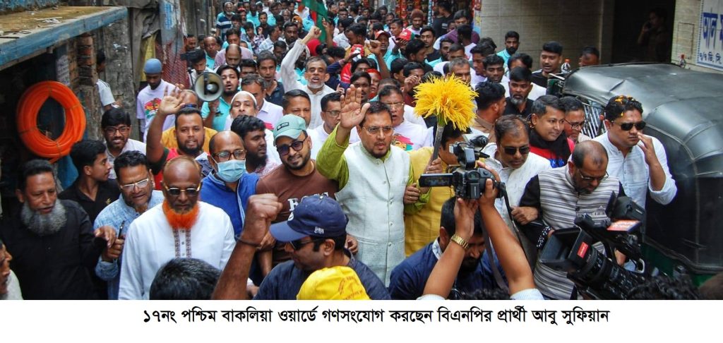 ২৯ জানুয়ারি (বৃহস্পতিবার) বিকালে ১৭নং পশ্চিম বাকলিয়া ওয়ার্ডের বৌবাজার, আফগান মসজিদ, ভরাপুকুর পাড়, দেওয়ানবাজার, মদিনা মসজিদ, শান্তিনগর, বগারবিল, মৌসুমি আবাসিক ও ডিসি রোড এলাকায় গণসংযোগকালে আয়োজিত এক পথসভায় প্রধান অতিথির বক্তব্যে তিনি এসব কথা বলেন। গণসংযোগ শেষে তিনি ডি.সি রোড মিয়ার বাপের মসজিদে জুমার নামাজ আদায় করেন। এসময় নেতাকর্মীদের পাশাপাশি এলাকার শত শত নারী-পুরুষ তারা ধানের শীষের প্রার্থী আবু সুফিয়ানকে সাদরে বরণ করেন এবং স্বতঃস্ফুর্তভাবে গণসংযোগে অংশগ্রহণ করেন।
