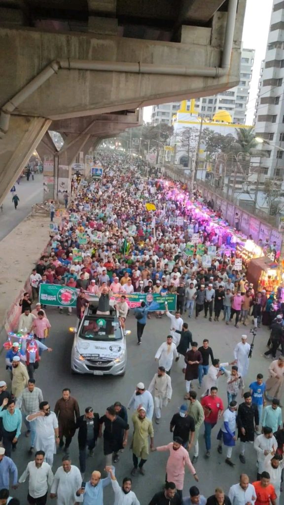 চট্টগ্রাম-১১ সংসদীয় আসনে বাংলাদেশ জামায়াতে ইসলামী মনোনীত ও ১১ দল সমর্থিত প্রার্থী জননেতা মোহাম্মদ শফিউল আলমের নেতৃত্বে এক বিশাল গণমিছিল অনুষ্ঠিত হয়েছে। গণমিছিলে সাধারণ মানুষের স্বতঃস্ফূর্ত অংশগ্রহণ লক্ষ্য করা যায়, যা এলাকায় ব্যাপক উৎসাহ ও উদ্দীপনার সৃষ্টি করে।