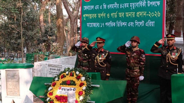 এদিন সকালে সিলেটে হযরত শাহজালাল (রহ.) মাজার সংলগ্ন কবরস্থানে শায়িত জেনারেল এম এ জি ওসমানীর সমাধিতে পুষ্পস্তবক অর্পণ করেন ১৭ পদাতিক ডিভিশনের জেনারেল অফিসার কমান্ডিং (জিওসি) ও সিলেট এরিয়া কমান্ডার মেজর জেনারেল মো. আলীমুল আমীন।