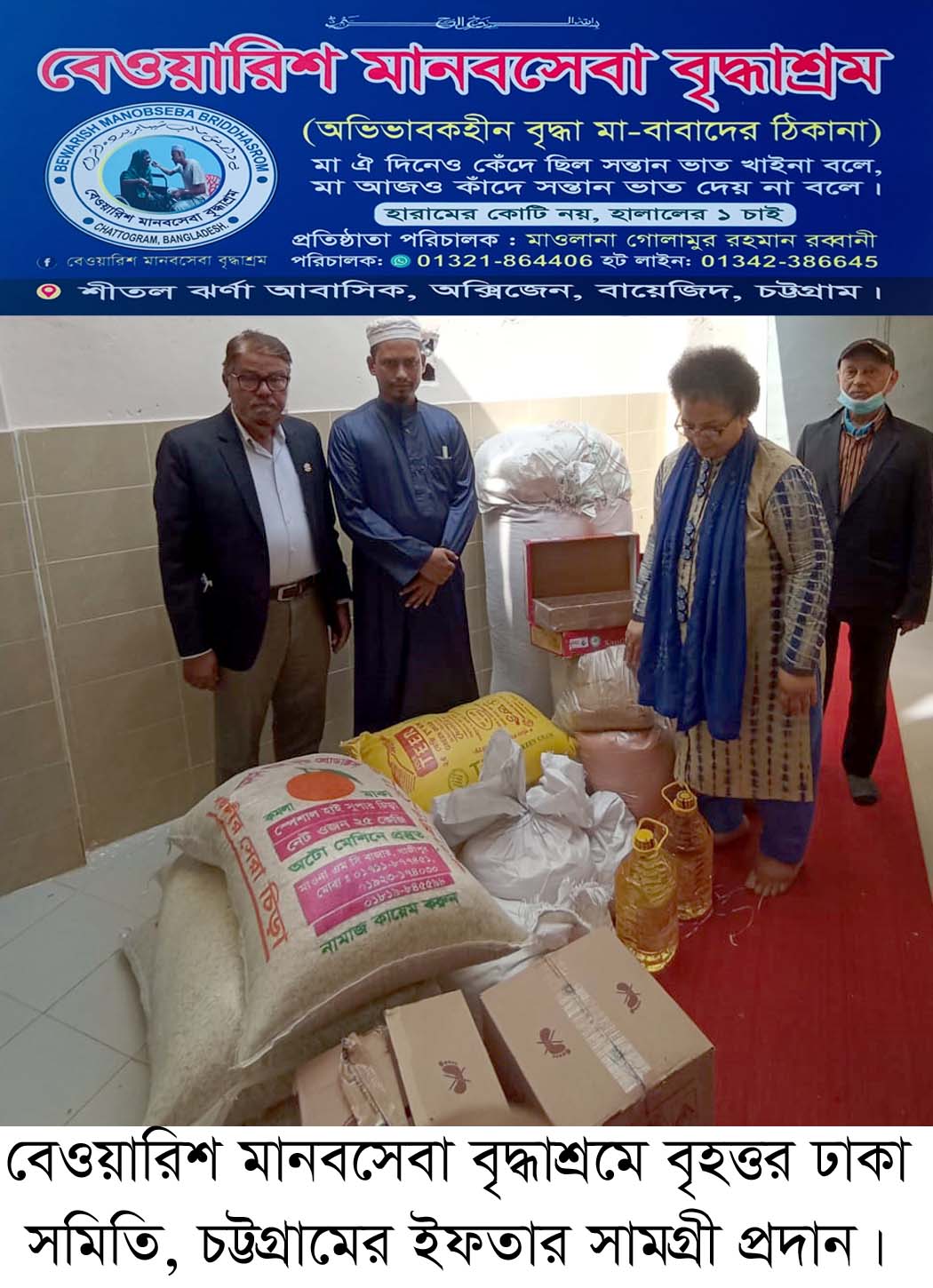 বেওয়ারিশ মানবসেবা ও বৃদ্ধাশ্রম কেন্দ্রের প্রতিষ্ঠাতা পরিচালক মাওলানা গোলামুর রহমান রব্বানী পবিত্র মাহে রমজান উপলক্ষে বৃদ্ধাশ্রমের বৃদ্ধা মা-বাবাদের জন্য ইফতার সামগ্রী প্রদান করায় বৃহত্তর ঢাকা সমিতি চট্টগ্রামকে ধন্যবাদ জানান এবং আগামীতে এ সেবা অব্যাহত রাখার অনুরোধ করেন।