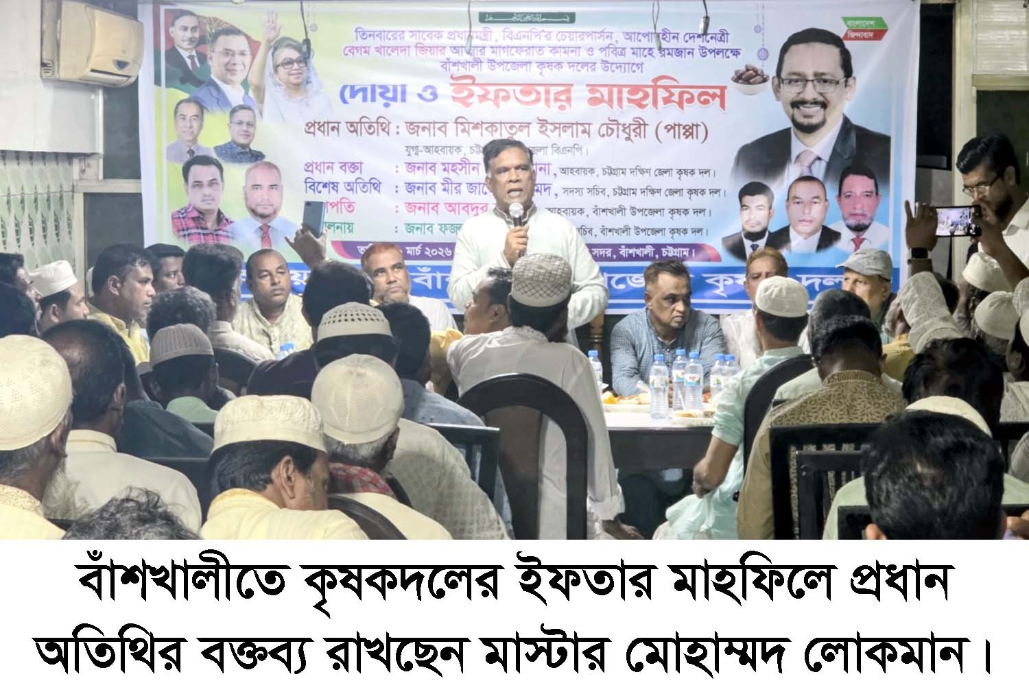 ইফতার ও দোয়া মাহফিলে উপজেলা কৃষকদলের আহ্বায়ক আবদুর রহমানের সভাপতিত্বে ও সিনিয়র যুগ্ম আহ্বায়ক ইসমাঈল এবং সদস্য সচিব ফজল কাদেরের যৌথ সঞ্চালনায় প্রধান বক্তা ছিলেন চট্টগ্রাম দক্ষিণ জেলা কৃষকদলের আহ্বায়ক মহসিন চৌধুরী রানা, বিশেষ অতিথি ছিলেন দক্ষিণ জেলা কৃষকদলের সদস্য সচিব মীর জাকের সিকদার, উপজেলা বিএনপির সাবেক যুগ্ম আহ্বায়ক ফজলুল কাদের, শিলকূপ ইউনিয়ন বিএনপির সাবেক আহ্বায়ক ডা. ইউনুস, উপজেলা যুবদলের সদস্য সচিব রাসেল চৌধুরী। ইফতার মাহফিলে প্রধান অতিথির বক্তব্যে মাস্টার লোকমান বলেন, ‘বিএনপি এদেশের কৃষকদের দল। দেশের ৯০% কৃষক বিএনপিকে ভালোবাসেন। বিএনপি যখনই ক্ষমতায় আসেন তখনই সর্বপ্রথম কৃষকদের উন্নয়নে কাজ করেন। আমাদের নেতা তারেক রহমান প্রধানমন্ত্রী হিসেবে শপথ নেওয়ার পর দিনই ১২ লাখ কৃষকের দেড় হাজার কোটি টাকার ঋণ মাফ করে দিয়েছেন। বিএনপি সরকার কৃষি বান্ধব সরকার। সামনে স্থানীয় সরকার নির্বাচন হবে, এতে আমাদের আরও ঐক্যবদ্ধ হয়ে দলের জন্য কাজ করতে হবে। নির্বাচনে প্রার্থীর চেহারা নয়, দলের মার্কা দেখে ভোট দিতে হবে। আগামীর যে কোন নির্বাচনে বিএনপির প্রার্থীর বিজয়ের জন্য সবাইকে ঐক্যবদ্ধভাবে দলের জন্য কাজ করতে হবে। এ সময় পবিত্র মাহে রমজান সংযম, সহমর্মিতা ও ভ্রাতৃত্ববোধের শিক্ষাকে ধারণ করে দেশ ও মানুষের কল্যাণে কাজ করার জন্য নেতাকর্মীদের প্রতি আহ্বান জানান তিনি।