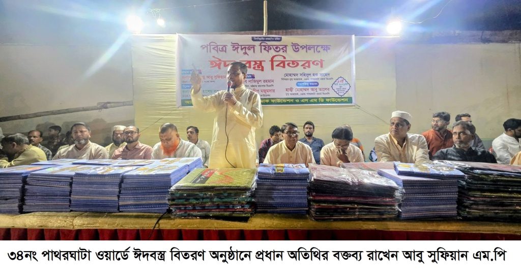 শুক্রবার (১৩ মার্চ) ৩৪নং পাথরঘাটা ওয়ার্ডে মরহুম আব্দুর রাজ্জাক ফাউন্ডেশনের উদ্যোগে আয়োজিত “ঈদবস্ত্র বিতরণ” অনুষ্ঠানে প্রধান অতিথির বক্তব্যে তিনি এ কথা বলেন। অনুষ্ঠানে ফাউন্ডেশনের পক্ষ থেকে ১৫০০ মানুষের মাঝে শাড়ি ও লুঙ্গি বিতরণ করা হয়।