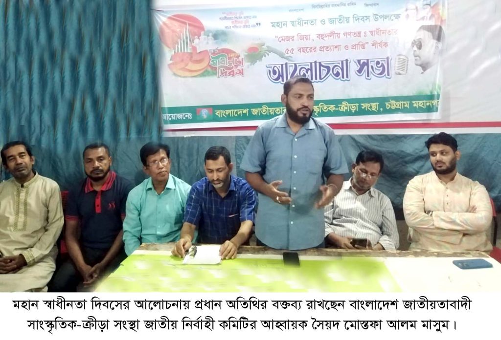 দেশচিন্তা ডেস্ক: বিএনপি নেতা ও বাংলাদেশ জাতীয়তাবাদী সাংস্কৃতিক-ক্রীড়া সংস্থা জাতীয় নির্বাহী কমিটির আহ্বায়ক সৈয়দ মোস্তফা আলম মাসুম বলেছেন, ১৯৭১ সালের মহান স্বাধীনতার ঘোষণা দিয়ে মেজর জিয়াউর রহমান বাংলাদেশের প্রান্তিক জনগোষ্ঠীকে হানাদার বাহিনীর বিরুদ্ধে যুদ্ধ করার জন্য সাহস যুগিয়েছিল। যার ফলশ্রুতিতে বাংলাদেশ একটি স্বাধীন দেশে পরিণত হয়েছিল। মেজর জিয়ার নেতৃত্বে দিশেহারা জাতিকে যে সাহস যুগিয়েছিল তার ধারাবাহিকতায় বাংলাদেশের বহুদলীয় গণতন্ত্র প্রতিষ্ঠাতেও তার ভূমিকা অত্যন্ত গুরুত্বপূর্ণ। ১৯৭৫ সালের পরে বাংলাদেশকে এক দলীয় শাসন ব্যবস্থা থেকে বের করে সকল দলকে রাজনীতি করার সুযোগ সৃষ্টি করে ছিলেন তৎকালীন জনপ্রিয় রাষ্ট্র নায়ক জিয়াউর রহমান। তার ধারাবাহিকতায় বাংলাদেশ যতবারই ষড়যন্ত্রের কবলে পড়েছিল ততবারই শহীদ জিয়ার প্রতিষ্ঠিত রাজনৈতিক দল বিএনপি দেশের কল্যাণে হাল ধরেছে। শহীদ জিয়ার শাহাদাত বরণের পর দেশনেত্রী বেগম খালেদা জিয়ার নেতৃত্বে স্বৈরাচার বিরোধী আন্দোলন এবং আধুনিক বাংলাদেশ বিনির্মাণে জনগণের কল্যাণে তারেক রহমানের নেতৃত্বে বিএনপি কাজ করে যাচ্ছে। তাই মেজর জিয়ার নেতৃত্বে বাংলাদেশের স্বাধীনতা যুদ্ধের ঘোষণা আজ সারা বিশ্বে স্বীকৃত। আগামী দিনে বাংলাদেশকে একটি গণতান্ত্রিক, জনকল্যাণকর, বন্ধু সুলভ পররাষ্ট্র নীতি নির্ভর একটি রাষ্ট্রে পরিণত করার জন্য বিএনপির চেয়ারম্যান ও প্রধান মন্ত্রী তারেক রহমানের নেতৃত্বে বাংলাদেশের সকল দেশপ্রেমিক জনগণকে ঐক্যবদ্ধ থেকে সকল ষড়যন্ত্র মোকাবেলায় সজাগ দৃষ্টি রাখার আহ্বান জানান। তিনি আজ বিকাল ৩.৩০ ঘটিকার সময় বাংলাদেশ জাতীয়তাবাদী সাংস্কৃতিক-ক্রীড়া সংস্থা চট্টগ্রাম মহানগরী কমিটির উদ্যোগে মহান স্বাধীনতা ও জাতীয় দিবস উপলক্ষ্যে “মেজর জিয়া, বহুদলীয় গণতন্ত্রঃ স্বাধীনতার ৫৫ বছরের প্রত্যাশা ও প্রাপ্তি” শীর্ষক আলোচনা সভায় প্রধান অতিথির বক্তব্য রাখতে গিয়ে এ কথা বলেন। সংগঠনের মহানগরের আহ্বায়ক মুহাম্মদ আয়ুব খান এর সভাপতিত্বে সদস্য সচিব জিএম কামাল রানার পরিচালনায় অন্যান্যদের মধ্যে বক্তব্য রাখেন সংগঠনের মহানগরের নেতা মুহাম্মদ আব্দুর রহিম, মুহাম্মদ শাহীন, মুহাম্মদ আব্দুর জব্বার, মুহাম্মদ ফখরুদ্দীন তাজবির, মুহাম্মদ শাফায়েত চৌধুরী, মুহাম্মদ জসিম উদ্দিন, মুহাম্মদ মাহীন ইন তিশার, জিএম দাইয়ান আকমাল আযান, মুহাম্মদ সাব্বির হোসাইন, মুহাম্মদ সাইফুল ইসলাম প্রমুখ।